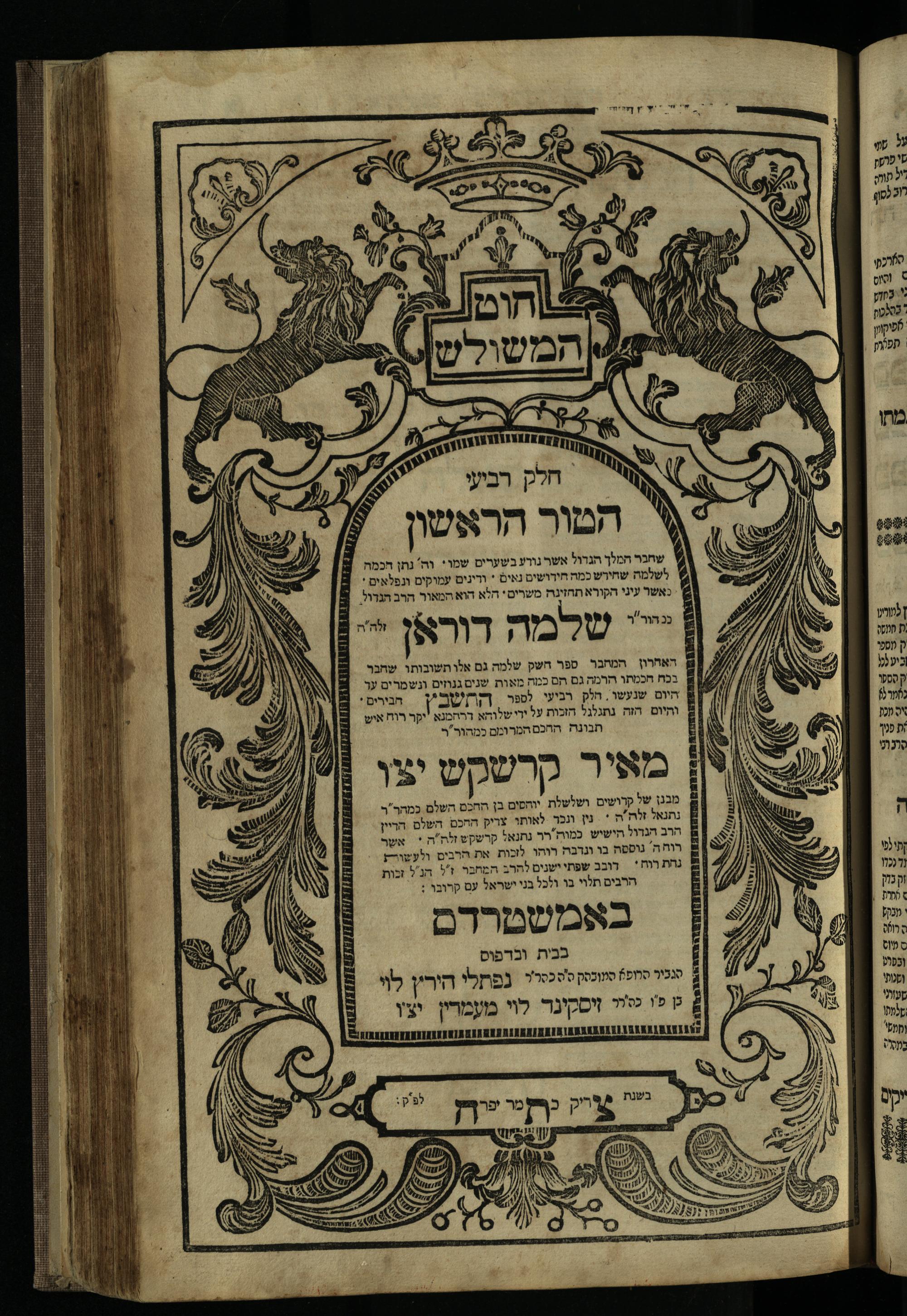 Ḥeleḳ reviʿi, ha-Ṭur ha-shelishi (1738) Ḥuṭ ha-meshulash / she-ḥiber ... Avraham ibn Ṭaṿah ... gam elu teshuvoto she-ḥiber be-koaḥ ḥokhmato ... gam hem ... ganuzim u-nishmarim ʿad ha-yom she-naʿaśu ḥeleḳ reviʿi le-sefer ha-Tashbets ... ṿe-ha-yom ha-zeh nitgalgel ha-zekhut ʿal yede ... Meʾir Ḳreśḳaś ... ben ... Netanʾel ...Ḥeleḳ reviʿi, ha-Ṭur ha-shelishi (1738) חוט המשולש / שחבר ... אברהם אבן טוואה ... גם אלו תשובותו שחבר בכח חכמתו ... גם הם ... גנוזים ונשמרים עד היום שנעשו חלק רביעי לספר התשבץ ...והיום הזה נתגלגל הזכות על ידי ... מאיר קרשקש ... בן ... נתנאל ...