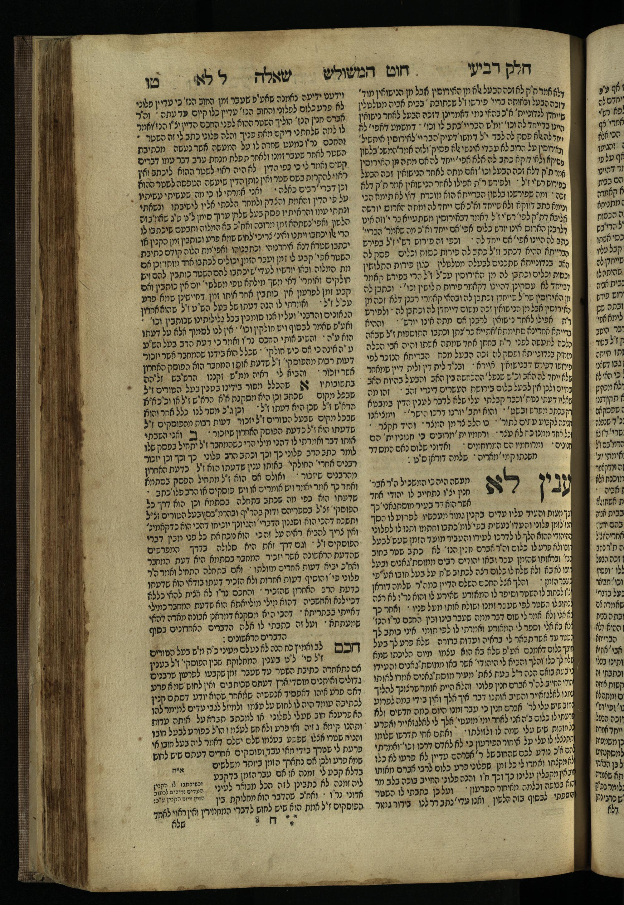 Ḥeleḳ reviʿi, ha-Ṭur ha-shelishi (1738) Ḥuṭ ha-meshulash / she-ḥiber ... Avraham ibn Ṭaṿah ... gam elu teshuvoto she-ḥiber be-koaḥ ḥokhmato ... gam hem ... ganuzim u-nishmarim ʿad ha-yom she-naʿaśu ḥeleḳ reviʿi le-sefer ha-Tashbets ... ṿe-ha-yom ha-zeh nitgalgel ha-zekhut ʿal yede ... Meʾir Ḳreśḳaś ... ben ... Netanʾel ...Ḥeleḳ reviʿi, ha-Ṭur ha-shelishi (1738) חוט המשולש / שחבר ... אברהם אבן טוואה ... גם אלו תשובותו שחבר בכח חכמתו ... גם הם ... גנוזים ונשמרים עד היום שנעשו חלק רביעי לספר התשבץ ...והיום הזה נתגלגל הזכות על ידי ... מאיר קרשקש ... בן ... נתנאל ...
