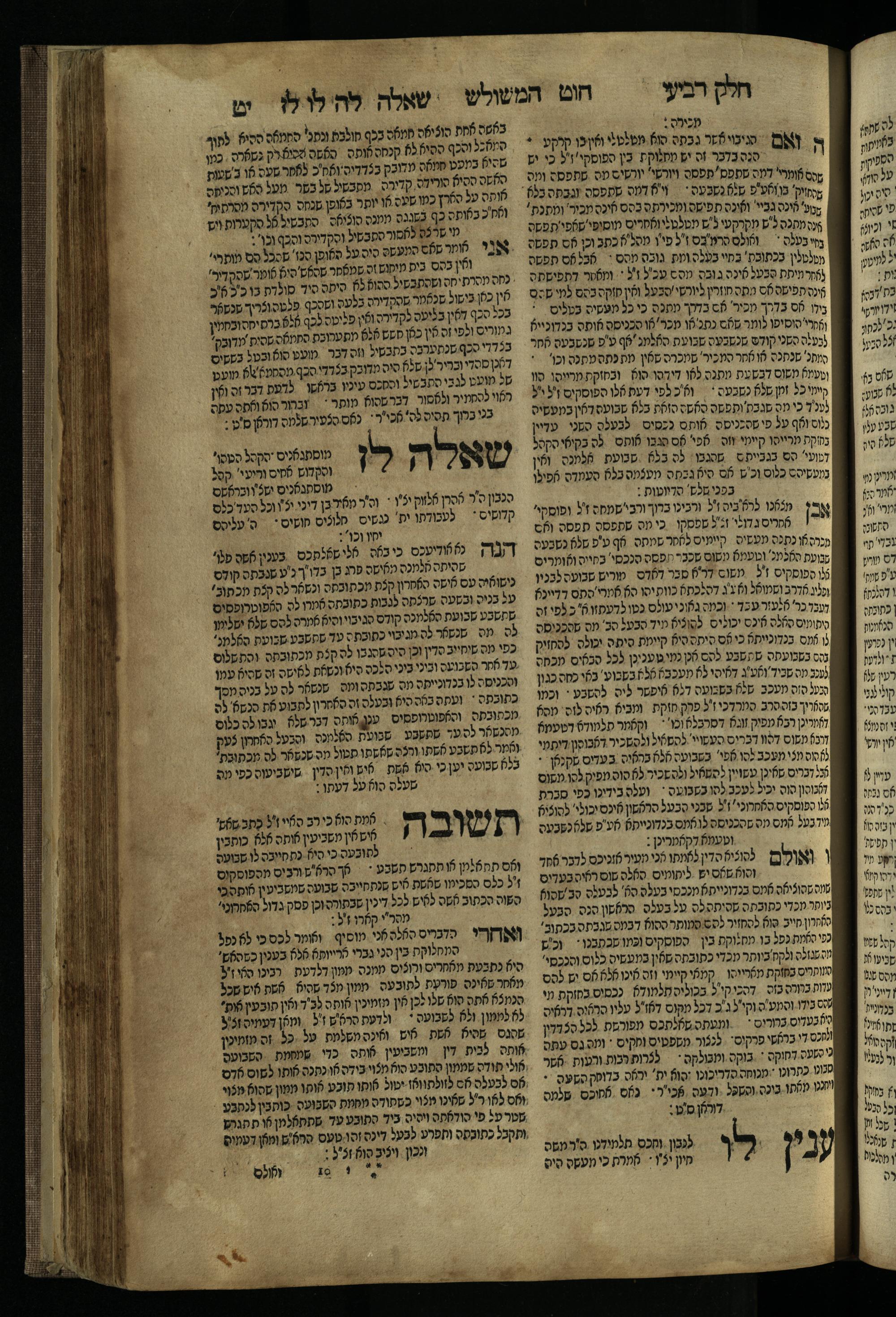 Ḥeleḳ reviʿi, ha-Ṭur ha-shelishi (1738) Ḥuṭ ha-meshulash / she-ḥiber ... Avraham ibn Ṭaṿah ... gam elu teshuvoto she-ḥiber be-koaḥ ḥokhmato ... gam hem ... ganuzim u-nishmarim ʿad ha-yom she-naʿaśu ḥeleḳ reviʿi le-sefer ha-Tashbets ... ṿe-ha-yom ha-zeh nitgalgel ha-zekhut ʿal yede ... Meʾir Ḳreśḳaś ... ben ... Netanʾel ...Ḥeleḳ reviʿi, ha-Ṭur ha-shelishi (1738) חוט המשולש / שחבר ... אברהם אבן טוואה ... גם אלו תשובותו שחבר בכח חכמתו ... גם הם ... גנוזים ונשמרים עד היום שנעשו חלק רביעי לספר התשבץ ...והיום הזה נתגלגל הזכות על ידי ... מאיר קרשקש ... בן ... נתנאל ...