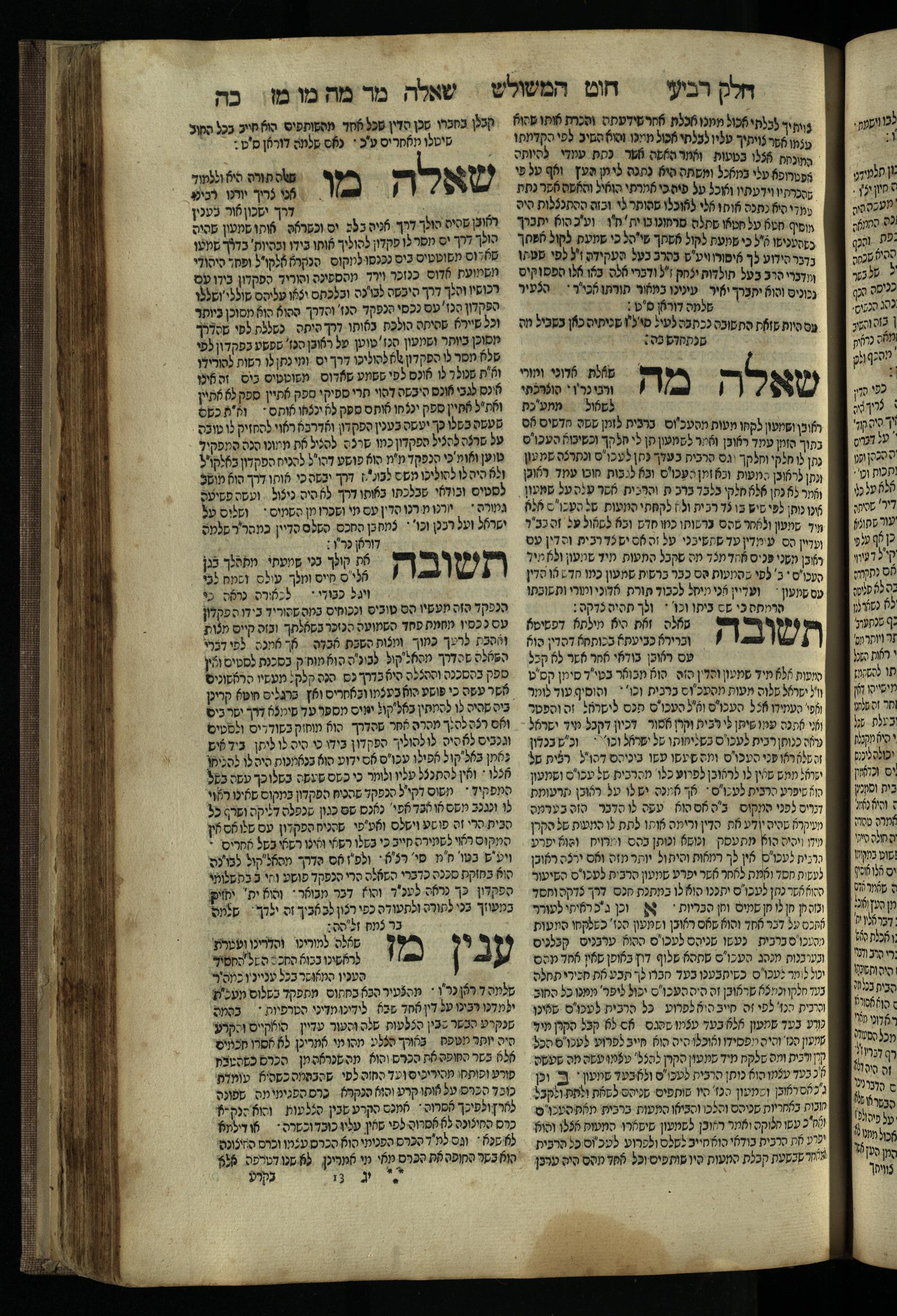 Ḥeleḳ reviʿi, ha-Ṭur ha-shelishi (1738) Ḥuṭ ha-meshulash / she-ḥiber ... Avraham ibn Ṭaṿah ... gam elu teshuvoto she-ḥiber be-koaḥ ḥokhmato ... gam hem ... ganuzim u-nishmarim ʿad ha-yom she-naʿaśu ḥeleḳ reviʿi le-sefer ha-Tashbets ... ṿe-ha-yom ha-zeh nitgalgel ha-zekhut ʿal yede ... Meʾir Ḳreśḳaś ... ben ... Netanʾel ...Ḥeleḳ reviʿi, ha-Ṭur ha-shelishi (1738) חוט המשולש / שחבר ... אברהם אבן טוואה ... גם אלו תשובותו שחבר בכח חכמתו ... גם הם ... גנוזים ונשמרים עד היום שנעשו חלק רביעי לספר התשבץ ...והיום הזה נתגלגל הזכות על ידי ... מאיר קרשקש ... בן ... נתנאל ...
