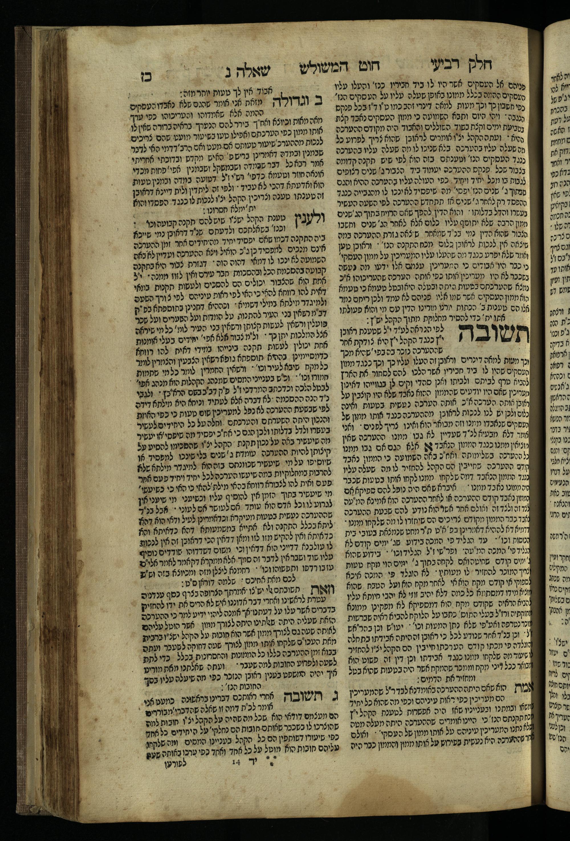 Ḥeleḳ reviʿi, ha-Ṭur ha-shelishi (1738) Ḥuṭ ha-meshulash / she-ḥiber ... Avraham ibn Ṭaṿah ... gam elu teshuvoto she-ḥiber be-koaḥ ḥokhmato ... gam hem ... ganuzim u-nishmarim ʿad ha-yom she-naʿaśu ḥeleḳ reviʿi le-sefer ha-Tashbets ... ṿe-ha-yom ha-zeh nitgalgel ha-zekhut ʿal yede ... Meʾir Ḳreśḳaś ... ben ... Netanʾel ...Ḥeleḳ reviʿi, ha-Ṭur ha-shelishi (1738) חוט המשולש / שחבר ... אברהם אבן טוואה ... גם אלו תשובותו שחבר בכח חכמתו ... גם הם ... גנוזים ונשמרים עד היום שנעשו חלק רביעי לספר התשבץ ...והיום הזה נתגלגל הזכות על ידי ... מאיר קרשקש ... בן ... נתנאל ...