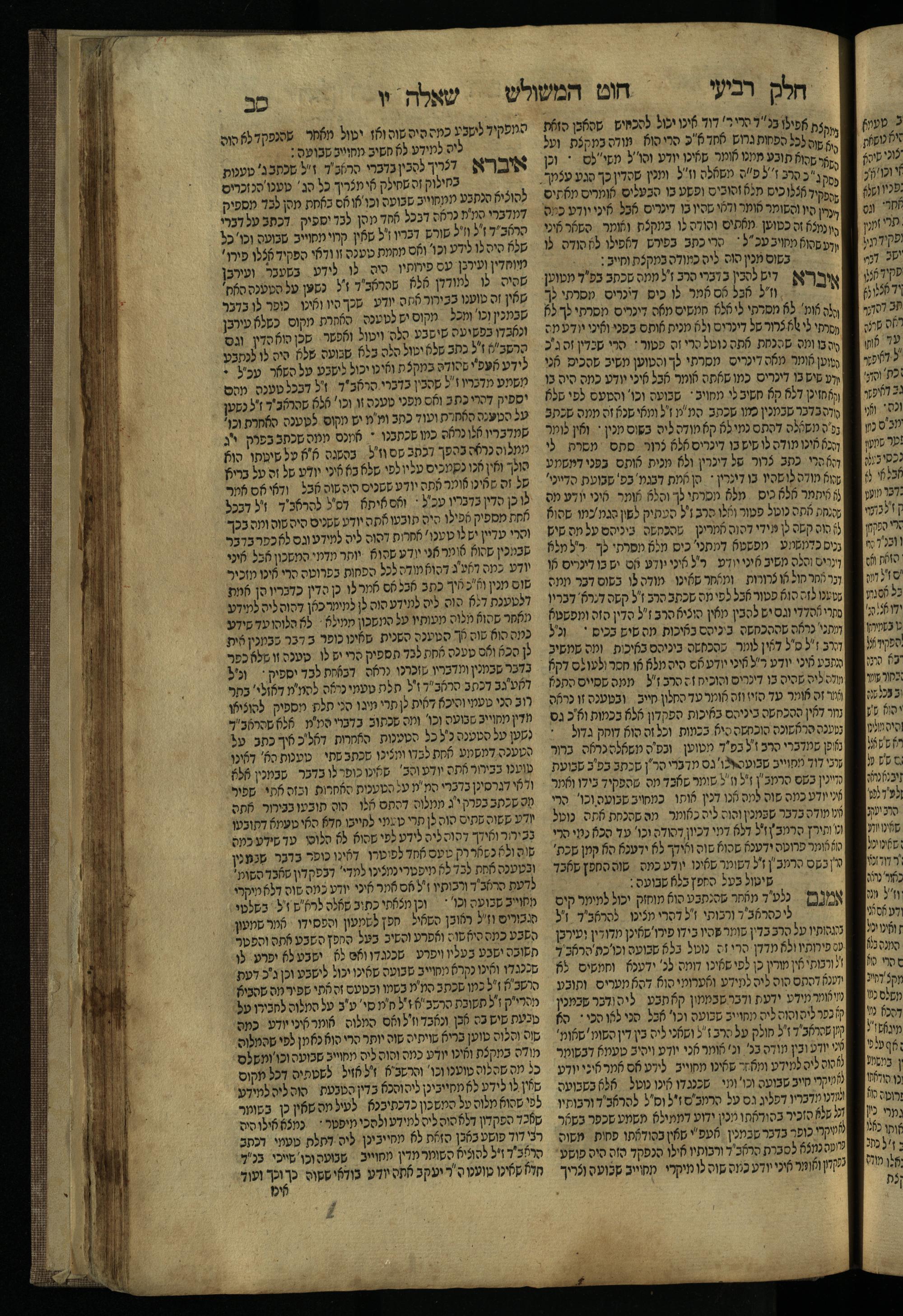 Ḥeleḳ reviʿi, ha-Ṭur ha-shelishi (1738) Ḥuṭ ha-meshulash / she-ḥiber ... Avraham ibn Ṭaṿah ... gam elu teshuvoto she-ḥiber be-koaḥ ḥokhmato ... gam hem ... ganuzim u-nishmarim ʿad ha-yom she-naʿaśu ḥeleḳ reviʿi le-sefer ha-Tashbets ... ṿe-ha-yom ha-zeh nitgalgel ha-zekhut ʿal yede ... Meʾir Ḳreśḳaś ... ben ... Netanʾel ...Ḥeleḳ reviʿi, ha-Ṭur ha-shelishi (1738) חוט המשולש / שחבר ... אברהם אבן טוואה ... גם אלו תשובותו שחבר בכח חכמתו ... גם הם ... גנוזים ונשמרים עד היום שנעשו חלק רביעי לספר התשבץ ...והיום הזה נתגלגל הזכות על ידי ... מאיר קרשקש ... בן ... נתנאל ...