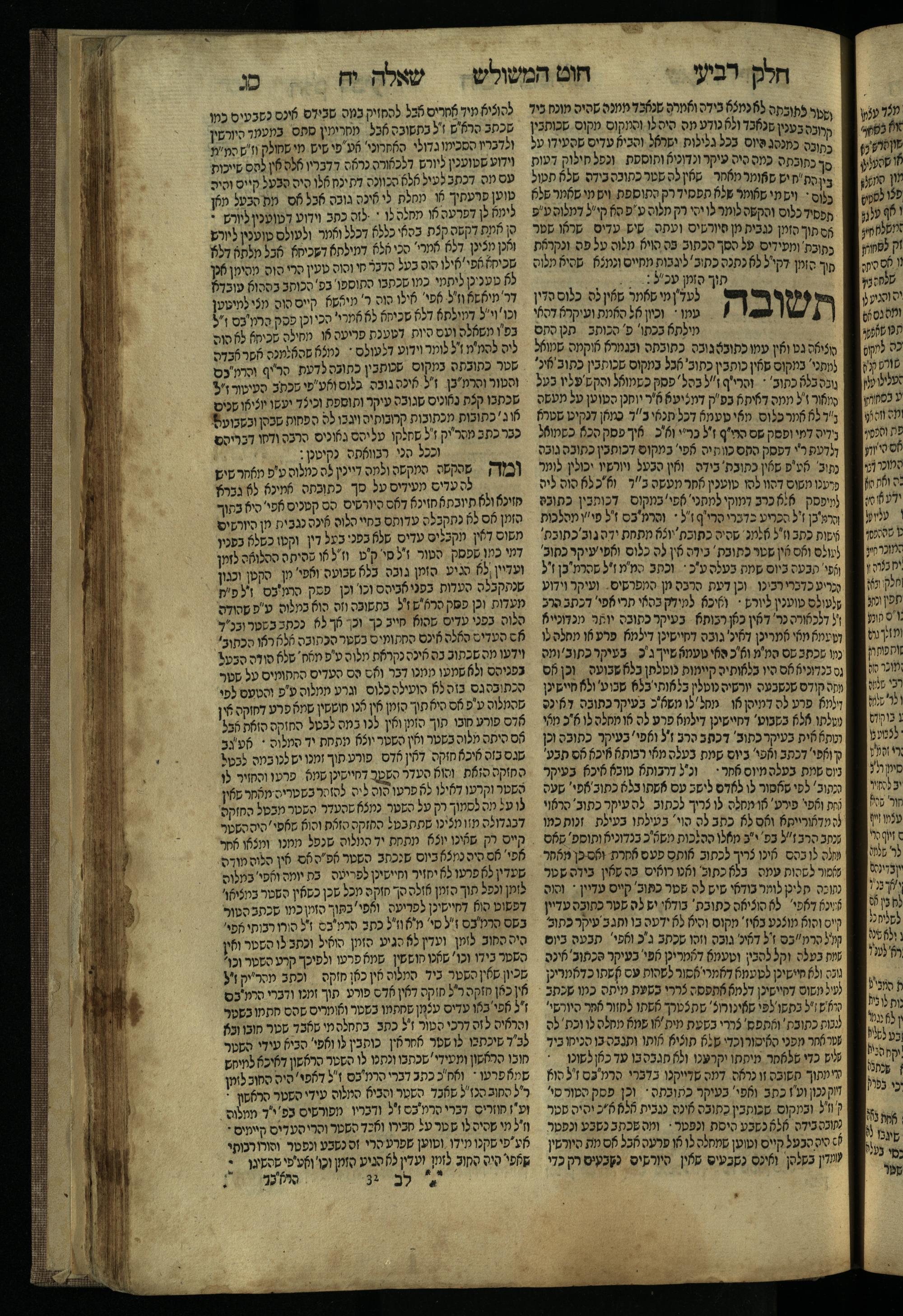 Ḥeleḳ reviʿi, ha-Ṭur ha-shelishi (1738) Ḥuṭ ha-meshulash / she-ḥiber ... Avraham ibn Ṭaṿah ... gam elu teshuvoto she-ḥiber be-koaḥ ḥokhmato ... gam hem ... ganuzim u-nishmarim ʿad ha-yom she-naʿaśu ḥeleḳ reviʿi le-sefer ha-Tashbets ... ṿe-ha-yom ha-zeh nitgalgel ha-zekhut ʿal yede ... Meʾir Ḳreśḳaś ... ben ... Netanʾel ...Ḥeleḳ reviʿi, ha-Ṭur ha-shelishi (1738) חוט המשולש / שחבר ... אברהם אבן טוואה ... גם אלו תשובותו שחבר בכח חכמתו ... גם הם ... גנוזים ונשמרים עד היום שנעשו חלק רביעי לספר התשבץ ...והיום הזה נתגלגל הזכות על ידי ... מאיר קרשקש ... בן ... נתנאל ...