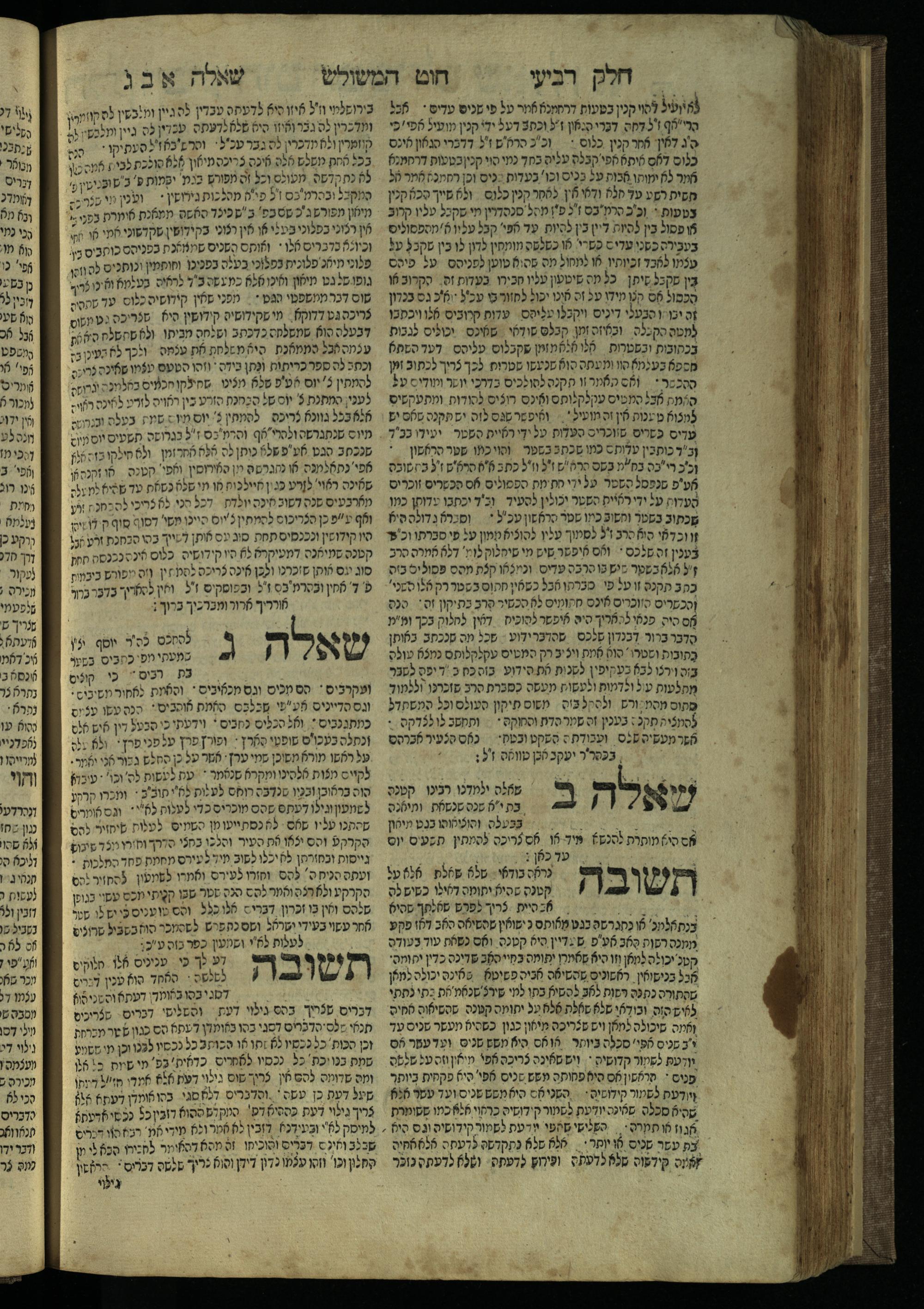 Ḥeleḳ reviʿi, ha-Ṭur ha-shelishi (1738) Ḥuṭ ha-meshulash / she-ḥiber ... Avraham ibn Ṭaṿah ... gam elu teshuvoto she-ḥiber be-koaḥ ḥokhmato ... gam hem ... ganuzim u-nishmarim ʿad ha-yom she-naʿaśu ḥeleḳ reviʿi le-sefer ha-Tashbets ... ṿe-ha-yom ha-zeh nitgalgel ha-zekhut ʿal yede ... Meʾir Ḳreśḳaś ... ben ... Netanʾel ...Ḥeleḳ reviʿi, ha-Ṭur ha-shelishi (1738) חוט המשולש / שחבר ... אברהם אבן טוואה ... גם אלו תשובותו שחבר בכח חכמתו ... גם הם ... גנוזים ונשמרים עד היום שנעשו חלק רביעי לספר התשבץ ...והיום הזה נתגלגל הזכות על ידי ... מאיר קרשקש ... בן ... נתנאל ...
