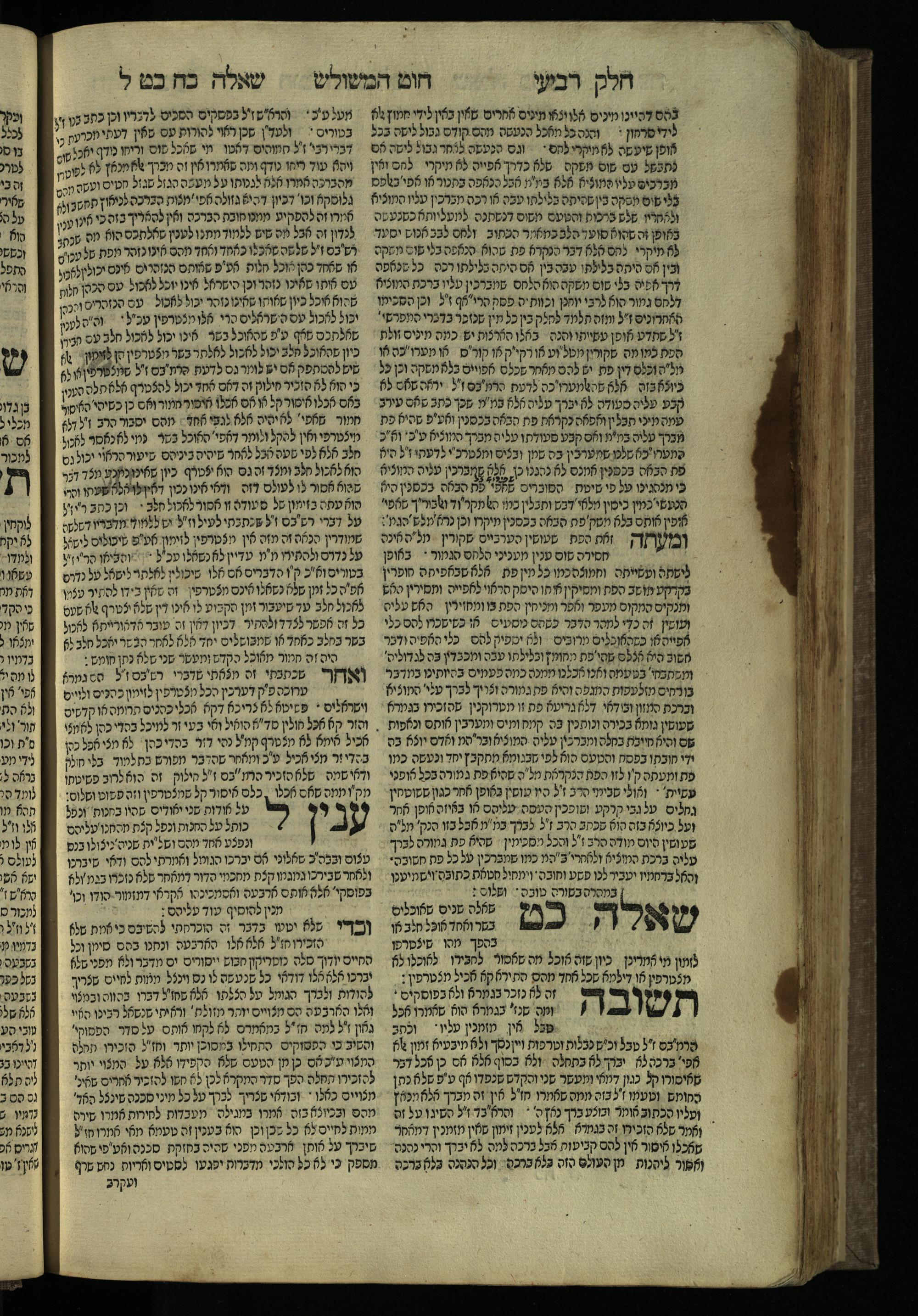 Ḥeleḳ reviʿi, ha-Ṭur ha-shelishi (1738) Ḥuṭ ha-meshulash / she-ḥiber ... Avraham ibn Ṭaṿah ... gam elu teshuvoto she-ḥiber be-koaḥ ḥokhmato ... gam hem ... ganuzim u-nishmarim ʿad ha-yom she-naʿaśu ḥeleḳ reviʿi le-sefer ha-Tashbets ... ṿe-ha-yom ha-zeh nitgalgel ha-zekhut ʿal yede ... Meʾir Ḳreśḳaś ... ben ... Netanʾel ...Ḥeleḳ reviʿi, ha-Ṭur ha-shelishi (1738) חוט המשולש / שחבר ... אברהם אבן טוואה ... גם אלו תשובותו שחבר בכח חכמתו ... גם הם ... גנוזים ונשמרים עד היום שנעשו חלק רביעי לספר התשבץ ...והיום הזה נתגלגל הזכות על ידי ... מאיר קרשקש ... בן ... נתנאל ...