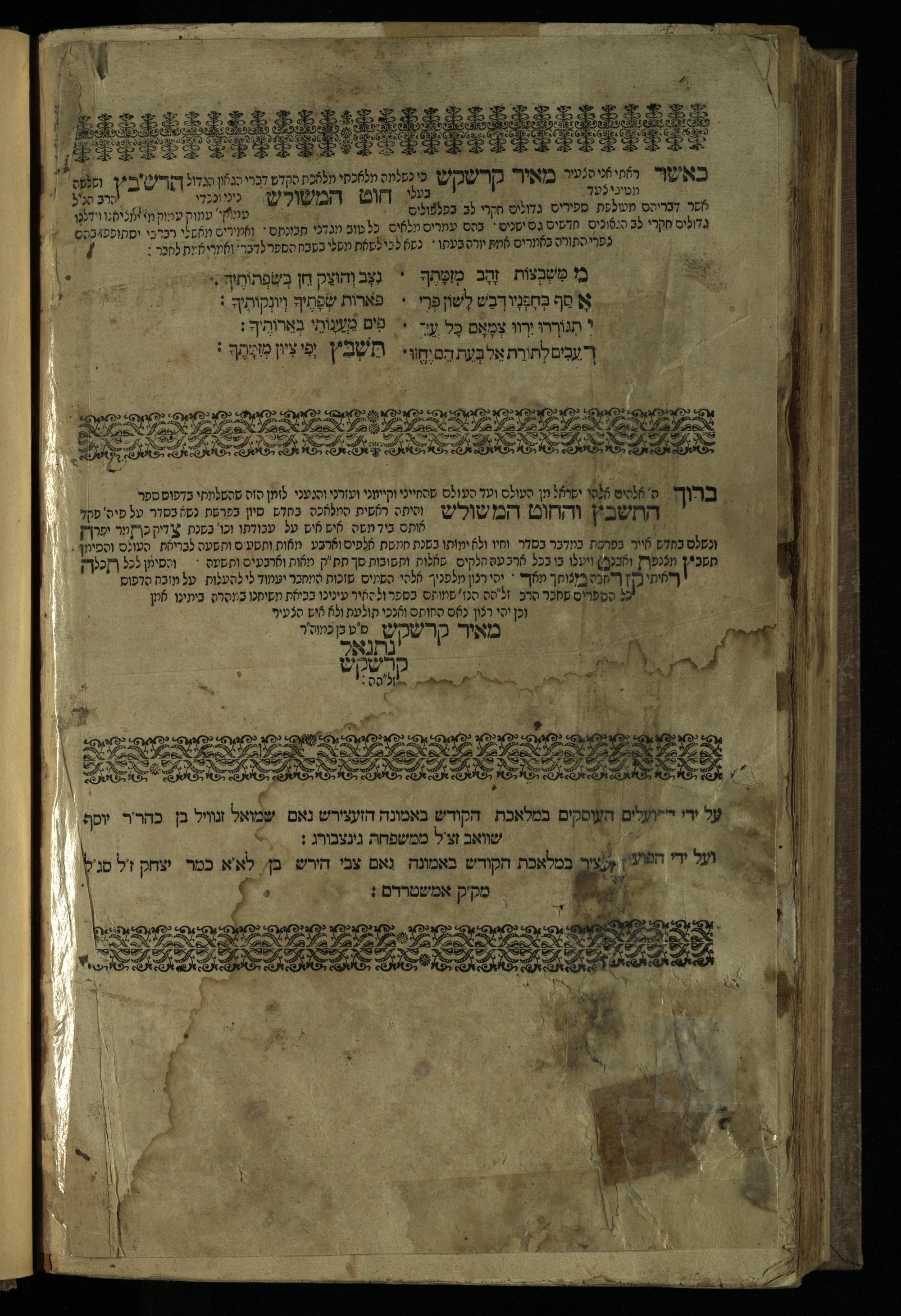 Ḥeleḳ reviʿi, ha-Ṭur ha-shelishi (1738) Ḥuṭ ha-meshulash / she-ḥiber ... Avraham ibn Ṭaṿah ... gam elu teshuvoto she-ḥiber be-koaḥ ḥokhmato ... gam hem ... ganuzim u-nishmarim ʿad ha-yom she-naʿaśu ḥeleḳ reviʿi le-sefer ha-Tashbets ... ṿe-ha-yom ha-zeh nitgalgel ha-zekhut ʿal yede ... Meʾir Ḳreśḳaś ... ben ... Netanʾel ...Ḥeleḳ reviʿi, ha-Ṭur ha-shelishi (1738) חוט המשולש / שחבר ... אברהם אבן טוואה ... גם אלו תשובותו שחבר בכח חכמתו ... גם הם ... גנוזים ונשמרים עד היום שנעשו חלק רביעי לספר התשבץ ...והיום הזה נתגלגל הזכות על ידי ... מאיר קרשקש ... בן ... נתנאל ...