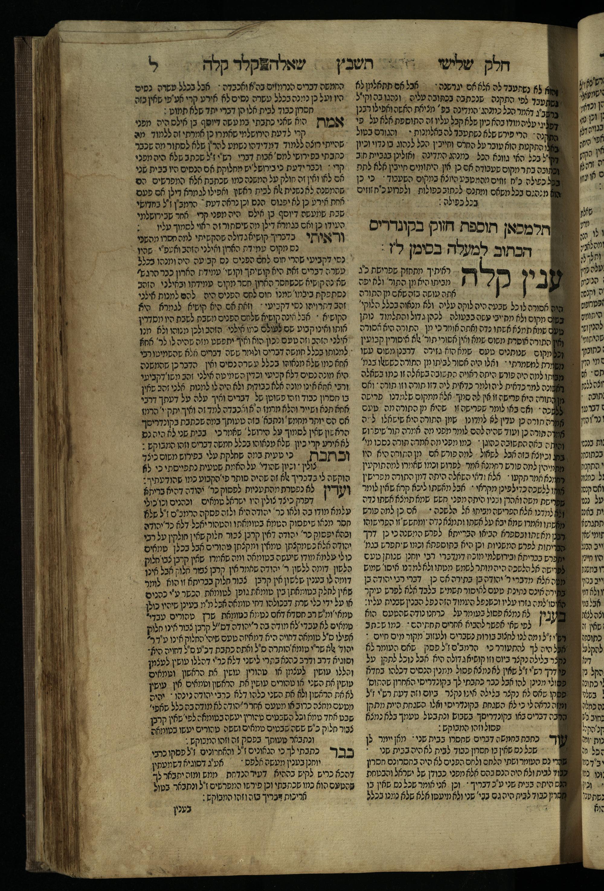 Ḥeleḳ reviʿi, ha-Ṭur ha-shelishi (1738) Ḥuṭ ha-meshulash / she-ḥiber ... Avraham ibn Ṭaṿah ... gam elu teshuvoto she-ḥiber be-koaḥ ḥokhmato ... gam hem ... ganuzim u-nishmarim ʿad ha-yom she-naʿaśu ḥeleḳ reviʿi le-sefer ha-Tashbets ... ṿe-ha-yom ha-zeh nitgalgel ha-zekhut ʿal yede ... Meʾir Ḳreśḳaś ... ben ... Netanʾel ...Ḥeleḳ reviʿi, ha-Ṭur ha-shelishi (1738) חוט המשולש / שחבר ... אברהם אבן טוואה ... גם אלו תשובותו שחבר בכח חכמתו ... גם הם ... גנוזים ונשמרים עד היום שנעשו חלק רביעי לספר התשבץ ...והיום הזה נתגלגל הזכות על ידי ... מאיר קרשקש ... בן ... נתנאל ...