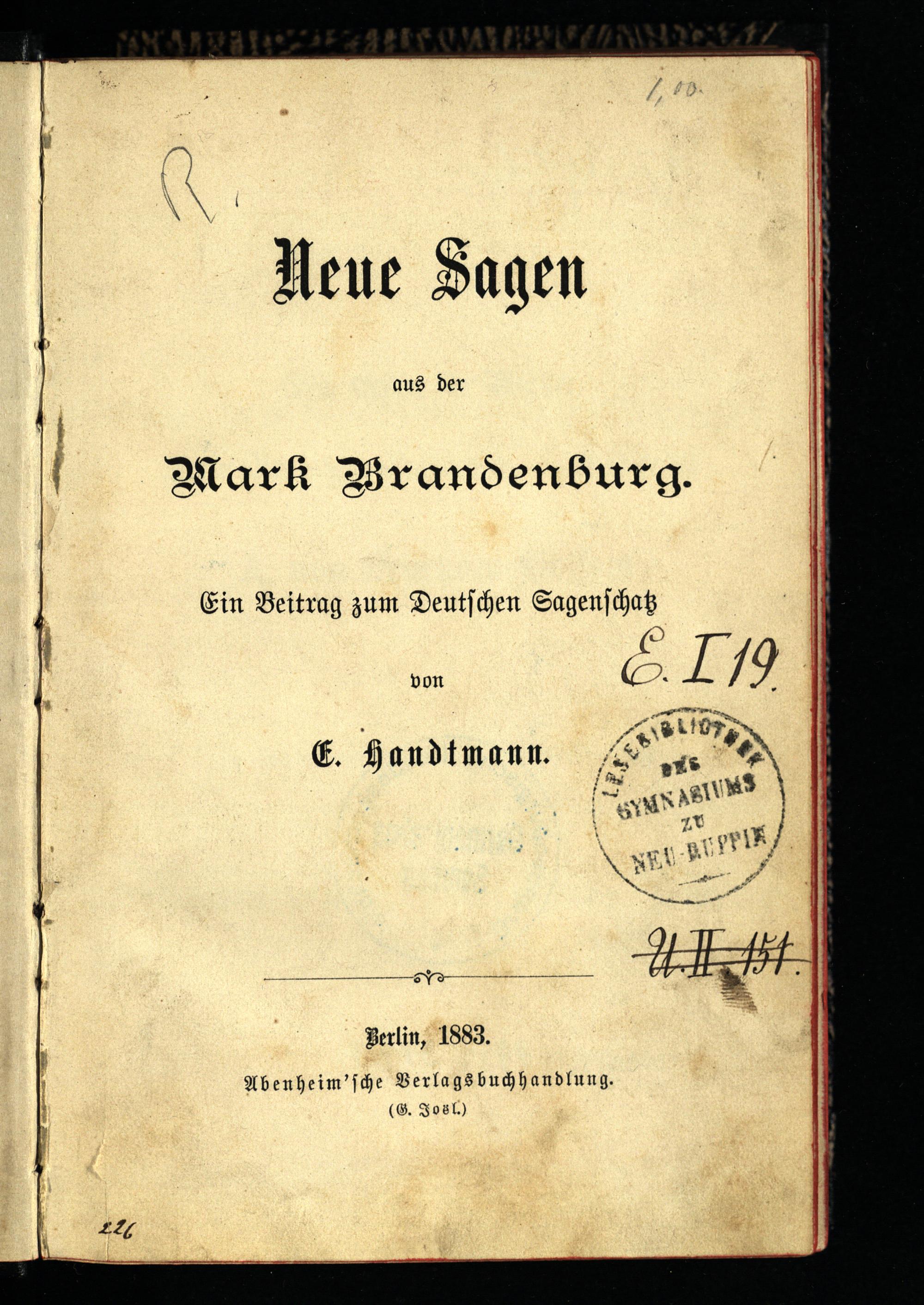 Neue Sagen aus der Mark Brandenburg : Ein Beitrag zum deutschen Sagenschatz / von E. Handtmann