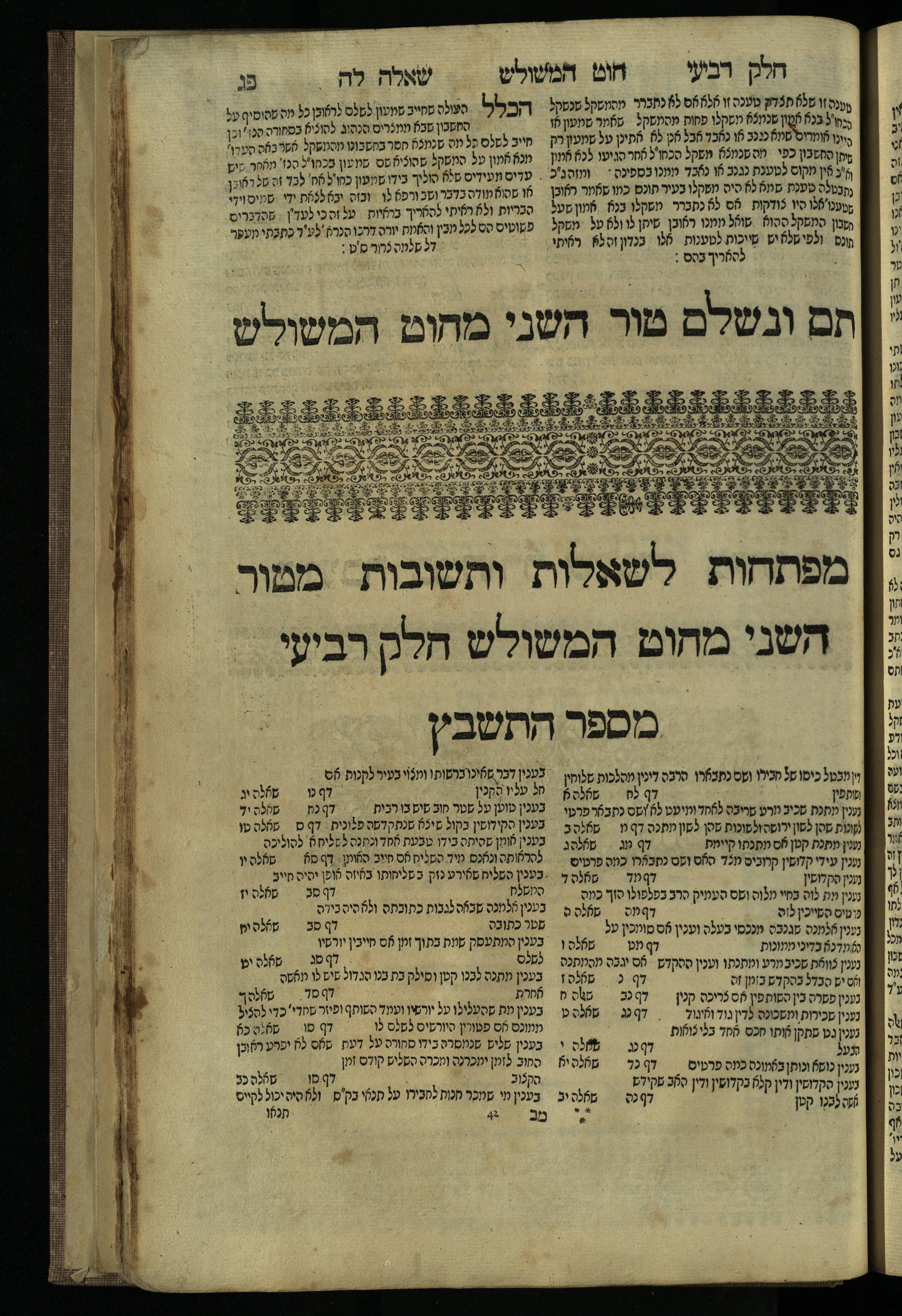 Ḥeleḳ reviʿi, ha-Ṭur ha-shelishi (1738) Ḥuṭ ha-meshulash / she-ḥiber ... Avraham ibn Ṭaṿah ... gam elu teshuvoto she-ḥiber be-koaḥ ḥokhmato ... gam hem ... ganuzim u-nishmarim ʿad ha-yom she-naʿaśu ḥeleḳ reviʿi le-sefer ha-Tashbets ... ṿe-ha-yom ha-zeh nitgalgel ha-zekhut ʿal yede ... Meʾir Ḳreśḳaś ... ben ... Netanʾel ...Ḥeleḳ reviʿi, ha-Ṭur ha-shelishi (1738) חוט המשולש / שחבר ... אברהם אבן טוואה ... גם אלו תשובותו שחבר בכח חכמתו ... גם הם ... גנוזים ונשמרים עד היום שנעשו חלק רביעי לספר התשבץ ...והיום הזה נתגלגל הזכות על ידי ... מאיר קרשקש ... בן ... נתנאל ...