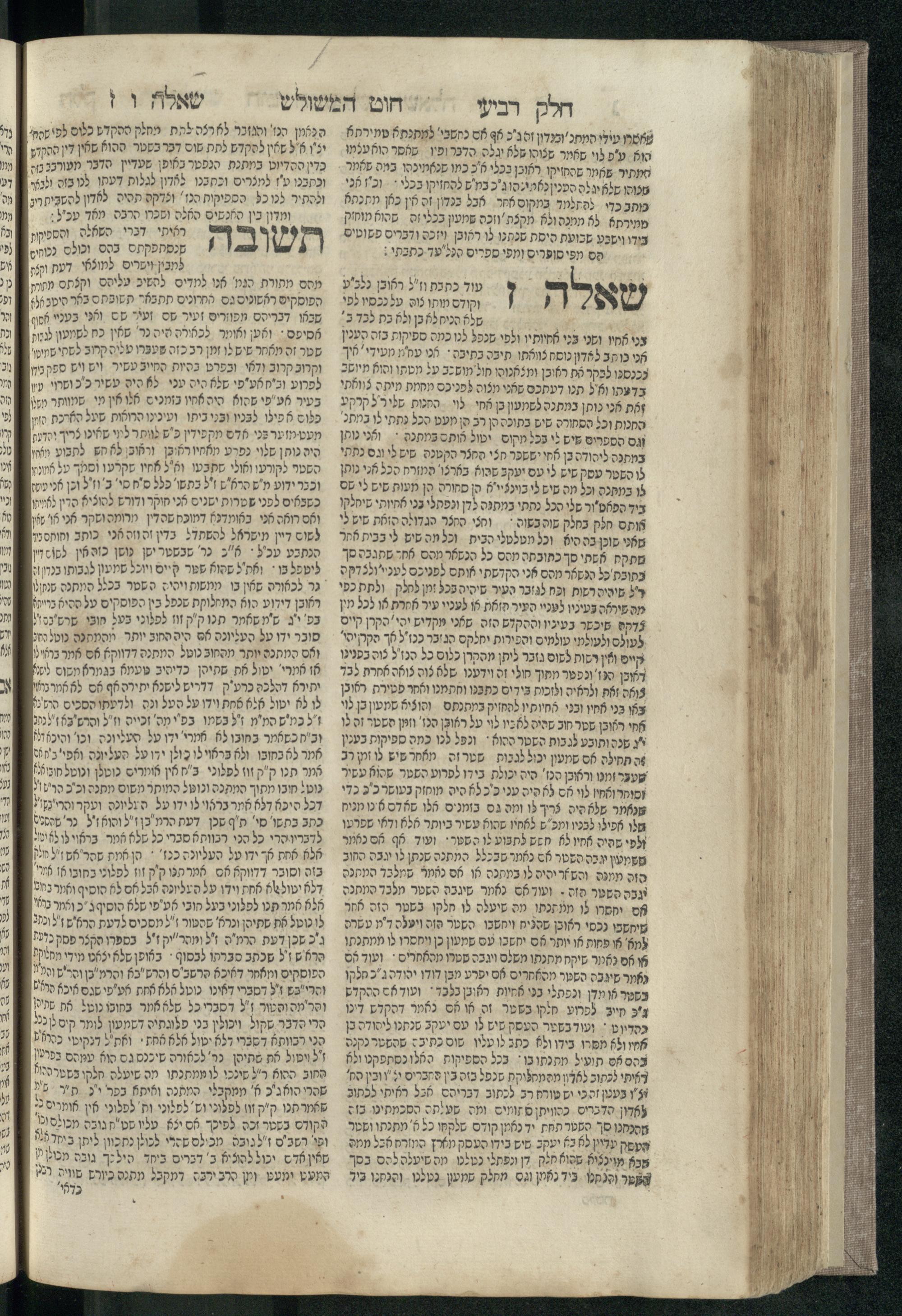 Ḥeleḳ reviʿi, ha-Ṭur ha-shelishi (1738) Ḥuṭ ha-meshulash / she-ḥiber ... Avraham ibn Ṭaṿah ... gam elu teshuvoto she-ḥiber be-koaḥ ḥokhmato ... gam hem ... ganuzim u-nishmarim ʿad ha-yom she-naʿaśu ḥeleḳ reviʿi le-sefer ha-Tashbets ... ṿe-ha-yom ha-zeh nitgalgel ha-zekhut ʿal yede ... Meʾir Ḳreśḳaś ... ben ... Netanʾel ...Ḥeleḳ reviʿi, ha-Ṭur ha-shelishi (1738) חוט המשולש / שחבר ... אברהם אבן טוואה ... גם אלו תשובותו שחבר בכח חכמתו ... גם הם ... גנוזים ונשמרים עד היום שנעשו חלק רביעי לספר התשבץ ...והיום הזה נתגלגל הזכות על ידי ... מאיר קרשקש ... בן ... נתנאל ...