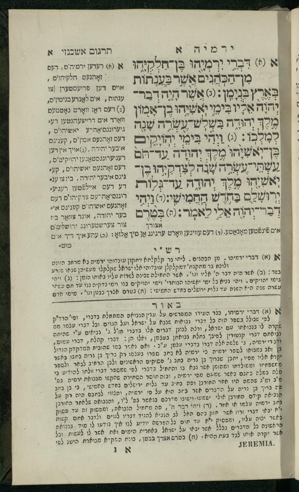 11 (1836) Sefer Yirmeyah / meturgam u-mevoʾar me-ḥadash me-et ha-Rav m.h. Shelomoh ben mo.h. Daṿid Zakhs (a.b.d. di-ḳ.ḳ. Likhṭenshṭadṭ u-gelilot Elenbogen ṿe-Zaʾats be-medinat Behmen) ṿe-nilṿah elaṿ Perush Rashi ṿe-haʿtaḳah u-veʾur kol milot be-laʿaz me-et ha-madpis Mosheh ha-Leṿi Landa11 (1836) ספר ירמיה / מתורגם ומבואר מחדש מאת הרב מ"ה שלמה בן מו"ה דוד זאכס (אב"ד דק"ק ליכטענשטאדט וגלילות עלנבאגען וזאאץ במדינת בעהמען) ונלוה אליו פירוש רש''י והעתקה ובאור כל מלות בלע''ז מאת המדפיס משה הלוי לנדא