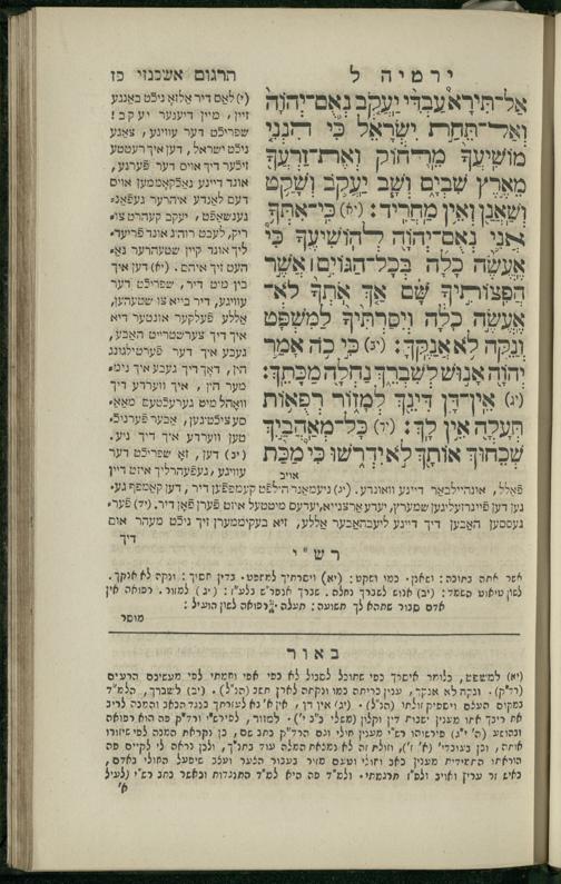 11 (1836) Sefer Yirmeyah / meturgam u-mevoʾar me-ḥadash me-et ha-Rav m.h. Shelomoh ben mo.h. Daṿid Zakhs (a.b.d. di-ḳ.ḳ. Likhṭenshṭadṭ u-gelilot Elenbogen ṿe-Zaʾats be-medinat Behmen) ṿe-nilṿah elaṿ Perush Rashi ṿe-haʿtaḳah u-veʾur kol milot be-laʿaz me-et ha-madpis Mosheh ha-Leṿi Landa11 (1836) ספר ירמיה / מתורגם ומבואר מחדש מאת הרב מ"ה שלמה בן מו"ה דוד זאכס (אב"ד דק"ק ליכטענשטאדט וגלילות עלנבאגען וזאאץ במדינת בעהמען) ונלוה אליו פירוש רש''י והעתקה ובאור כל מלות בלע''ז מאת המדפיס משה הלוי לנדא