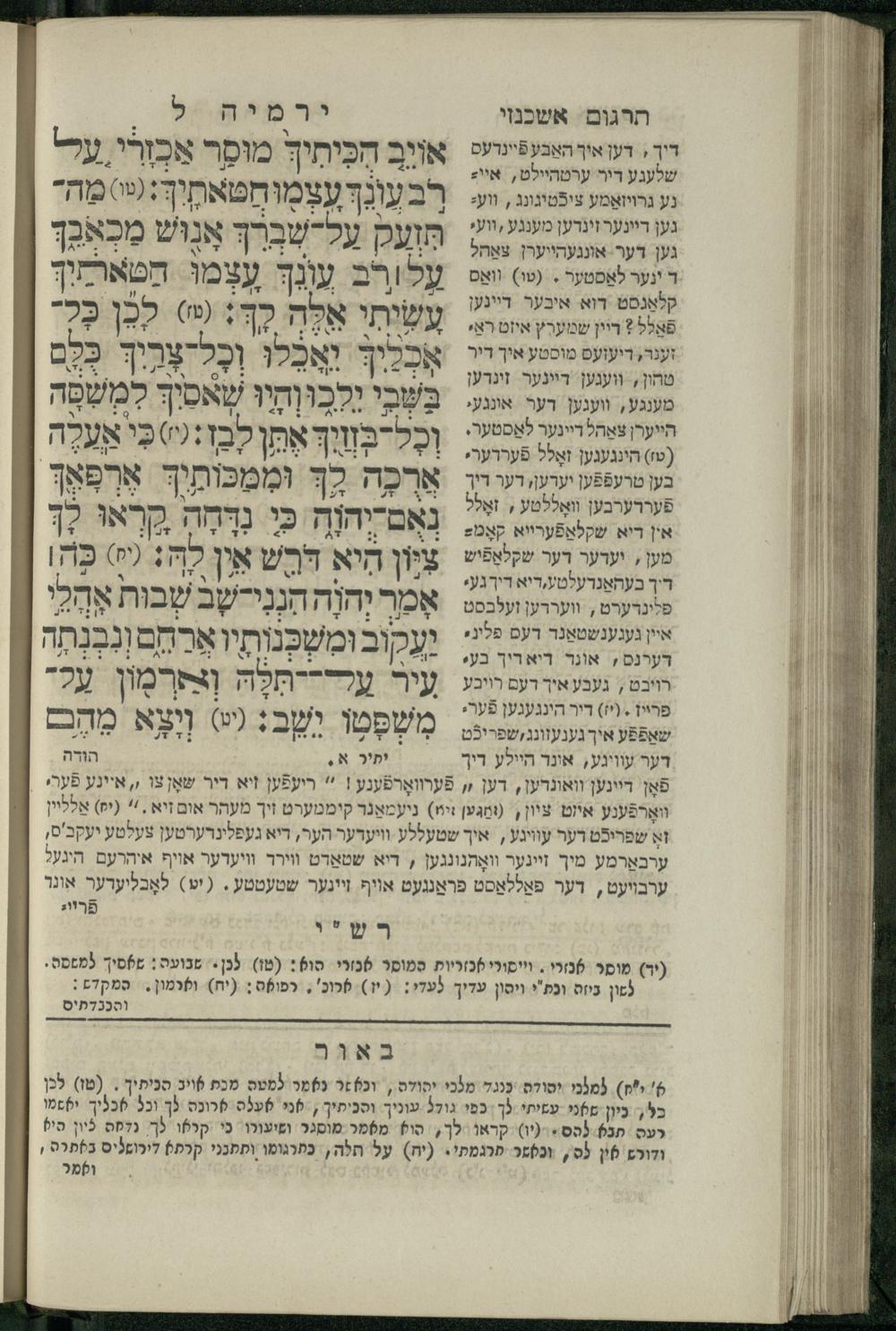 11 (1836) Sefer Yirmeyah / meturgam u-mevoʾar me-ḥadash me-et ha-Rav m.h. Shelomoh ben mo.h. Daṿid Zakhs (a.b.d. di-ḳ.ḳ. Likhṭenshṭadṭ u-gelilot Elenbogen ṿe-Zaʾats be-medinat Behmen) ṿe-nilṿah elaṿ Perush Rashi ṿe-haʿtaḳah u-veʾur kol milot be-laʿaz me-et ha-madpis Mosheh ha-Leṿi Landa11 (1836) ספר ירמיה / מתורגם ומבואר מחדש מאת הרב מ"ה שלמה בן מו"ה דוד זאכס (אב"ד דק"ק ליכטענשטאדט וגלילות עלנבאגען וזאאץ במדינת בעהמען) ונלוה אליו פירוש רש''י והעתקה ובאור כל מלות בלע''ז מאת המדפיס משה הלוי לנדא