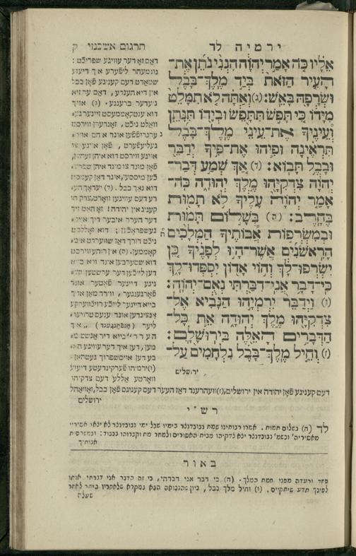 11 (1836) Sefer Yirmeyah / meturgam u-mevoʾar me-ḥadash me-et ha-Rav m.h. Shelomoh ben mo.h. Daṿid Zakhs (a.b.d. di-ḳ.ḳ. Likhṭenshṭadṭ u-gelilot Elenbogen ṿe-Zaʾats be-medinat Behmen) ṿe-nilṿah elaṿ Perush Rashi ṿe-haʿtaḳah u-veʾur kol milot be-laʿaz me-et ha-madpis Mosheh ha-Leṿi Landa11 (1836) ספר ירמיה / מתורגם ומבואר מחדש מאת הרב מ"ה שלמה בן מו"ה דוד זאכס (אב"ד דק"ק ליכטענשטאדט וגלילות עלנבאגען וזאאץ במדינת בעהמען) ונלוה אליו פירוש רש''י והעתקה ובאור כל מלות בלע''ז מאת המדפיס משה הלוי לנדא