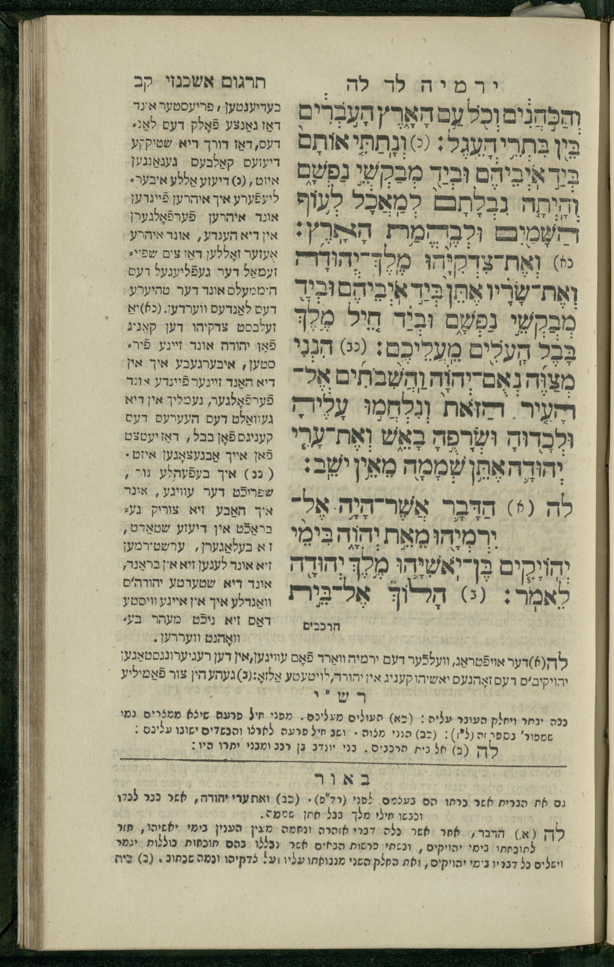 11 (1836) Sefer Yirmeyah / meturgam u-mevoʾar me-ḥadash me-et ha-Rav m.h. Shelomoh ben mo.h. Daṿid Zakhs (a.b.d. di-ḳ.ḳ. Likhṭenshṭadṭ u-gelilot Elenbogen ṿe-Zaʾats be-medinat Behmen) ṿe-nilṿah elaṿ Perush Rashi ṿe-haʿtaḳah u-veʾur kol milot be-laʿaz me-et ha-madpis Mosheh ha-Leṿi Landa11 (1836) ספר ירמיה / מתורגם ומבואר מחדש מאת הרב מ"ה שלמה בן מו"ה דוד זאכס (אב"ד דק"ק ליכטענשטאדט וגלילות עלנבאגען וזאאץ במדינת בעהמען) ונלוה אליו פירוש רש''י והעתקה ובאור כל מלות בלע''ז מאת המדפיס משה הלוי לנדא