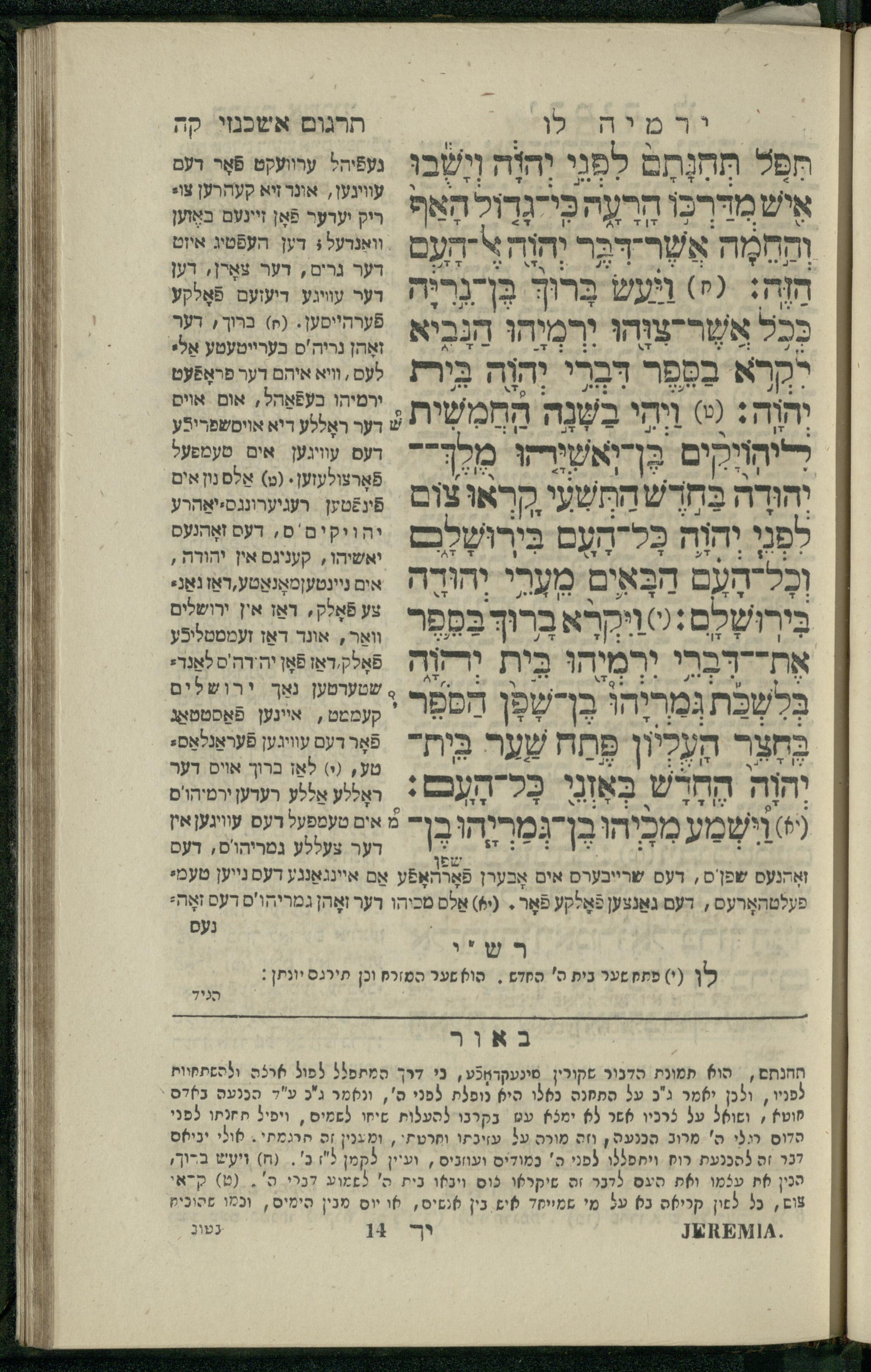 11 (1836) Sefer Yirmeyah / meturgam u-mevoʾar me-ḥadash me-et ha-Rav m.h. Shelomoh ben mo.h. Daṿid Zakhs (a.b.d. di-ḳ.ḳ. Likhṭenshṭadṭ u-gelilot Elenbogen ṿe-Zaʾats be-medinat Behmen) ṿe-nilṿah elaṿ Perush Rashi ṿe-haʿtaḳah u-veʾur kol milot be-laʿaz me-et ha-madpis Mosheh ha-Leṿi Landa11 (1836) ספר ירמיה / מתורגם ומבואר מחדש מאת הרב מ"ה שלמה בן מו"ה דוד זאכס (אב"ד דק"ק ליכטענשטאדט וגלילות עלנבאגען וזאאץ במדינת בעהמען) ונלוה אליו פירוש רש''י והעתקה ובאור כל מלות בלע''ז מאת המדפיס משה הלוי לנדא