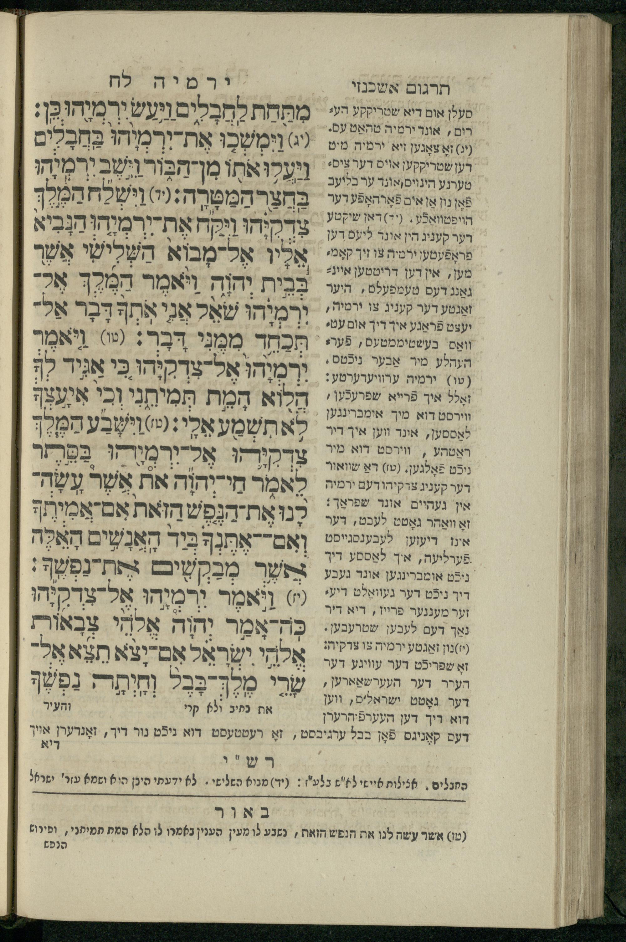 11 (1836) Sefer Yirmeyah / meturgam u-mevoʾar me-ḥadash me-et ha-Rav m.h. Shelomoh ben mo.h. Daṿid Zakhs (a.b.d. di-ḳ.ḳ. Likhṭenshṭadṭ u-gelilot Elenbogen ṿe-Zaʾats be-medinat Behmen) ṿe-nilṿah elaṿ Perush Rashi ṿe-haʿtaḳah u-veʾur kol milot be-laʿaz me-et ha-madpis Mosheh ha-Leṿi Landa11 (1836) ספר ירמיה / מתורגם ומבואר מחדש מאת הרב מ"ה שלמה בן מו"ה דוד זאכס (אב"ד דק"ק ליכטענשטאדט וגלילות עלנבאגען וזאאץ במדינת בעהמען) ונלוה אליו פירוש רש''י והעתקה ובאור כל מלות בלע''ז מאת המדפיס משה הלוי לנדא