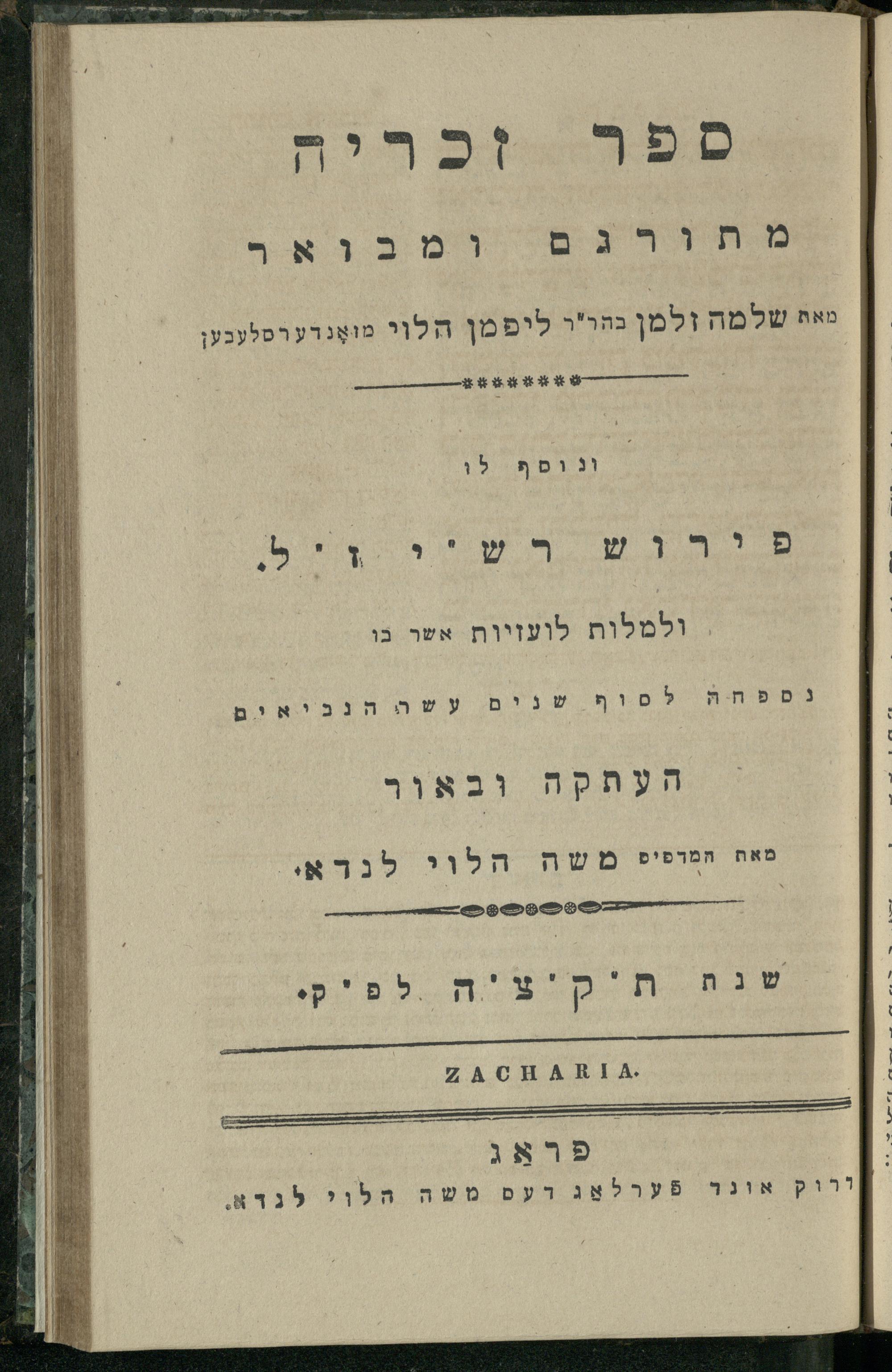 13 (1835) Sifre Tere ʿAśar : ʿim Perush Rashi ṿe-targum Ashkenazi u-veʾur / me-et metargemim u-mevaʾarim mefoʾarim bi-shemotam ʿale adamot ṿe-hugah me-ḥadash bi-sheḳidah rabah u-ve-ʿiyun gadol ; ṿe-nispeḥah le-sof Tere ʿAśar haʿtaḳah u-veʾur le-khol milot be-laʿaz ha-nimtsaʾot be-Fe. Rashi z.l. me-et ha-madpis Mosheh ha-Leṿi Landa13 (1835) ספרי תרי עשר : עם פירוש רש''י ותרגום אשכנזי ובאור / מאת מתרגמים ומבארים מפוארים בשמותם עלי אדמות והוגה מחדש בשקידה רבה ובעיון גדול ; ונספחה לסוף תרי עשר העתקה ובאור לכל מלות בלע''ז הנמצאות בפירש"י ז"ל מאת המדפיס משה הלוי לנדא