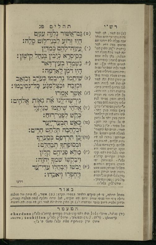 15 (1835) Sefer Tehilim / ʿim Perush Rashi ṿe-targum Ashkenazi me-et Rabenu Mosheh ben Menaḥem n.ʿE., u-veʾur me-et ha-ḥakham ha-mefursam R. Yoʾel Bril asher ḳara be-shem Zemirot Yiśraʾel, ṿe-nilṿeh elaṿ ha-Maʿamar me-et ha-ḥakham ha-medaḳdeḳ mo.h. Ṿolf Meʾir (moreh lashon ʿIvri be-vet ḥinukh ha-normali asher be-Prag), u-ve-tokho nikhlal haʿataḳah u-veʾur le-khol milot be-laʿaz ha-nimtsaʾot be-Fe. Rashi z.l. me-et ha-madpis Mosheh ha-Leṿi Landa15 (1835) ספר תהלים / עם פירוש רש''י ותרגום אשכנזי מאת רבינו משה בן מנחם נ"ע, ובאור מאת החכם המפורסם ר' יואל ברי"ל אשר קרא בשם זמירות ישראל, ונלוה אליו המעמר מאת החכם המדקדק מו"ה וואלף מאיר (מורה לשון עברי בבית חנוך הנארמאלי אשר בפראג), ובתוכו נכלל העתקה ובאור לכל מלות בלע"ז הנמצאות בפירש"י ז"ל מאת המדפיס משה הלוי לנדא