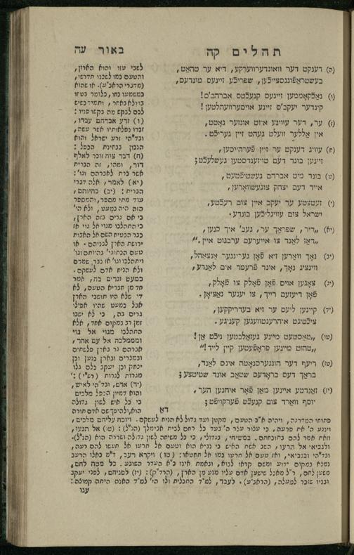 15 (1835) Sefer Tehilim / ʿim Perush Rashi ṿe-targum Ashkenazi me-et Rabenu Mosheh ben Menaḥem n.ʿE., u-veʾur me-et ha-ḥakham ha-mefursam R. Yoʾel Bril asher ḳara be-shem Zemirot Yiśraʾel, ṿe-nilṿeh elaṿ ha-Maʿamar me-et ha-ḥakham ha-medaḳdeḳ mo.h. Ṿolf Meʾir (moreh lashon ʿIvri be-vet ḥinukh ha-normali asher be-Prag), u-ve-tokho nikhlal haʿataḳah u-veʾur le-khol milot be-laʿaz ha-nimtsaʾot be-Fe. Rashi z.l. me-et ha-madpis Mosheh ha-Leṿi Landa15 (1835) ספר תהלים / עם פירוש רש''י ותרגום אשכנזי מאת רבינו משה בן מנחם נ"ע, ובאור מאת החכם המפורסם ר' יואל ברי"ל אשר קרא בשם זמירות ישראל, ונלוה אליו המעמר מאת החכם המדקדק מו"ה וואלף מאיר (מורה לשון עברי בבית חנוך הנארמאלי אשר בפראג), ובתוכו נכלל העתקה ובאור לכל מלות בלע"ז הנמצאות בפירש"י ז"ל מאת המדפיס משה הלוי לנדא