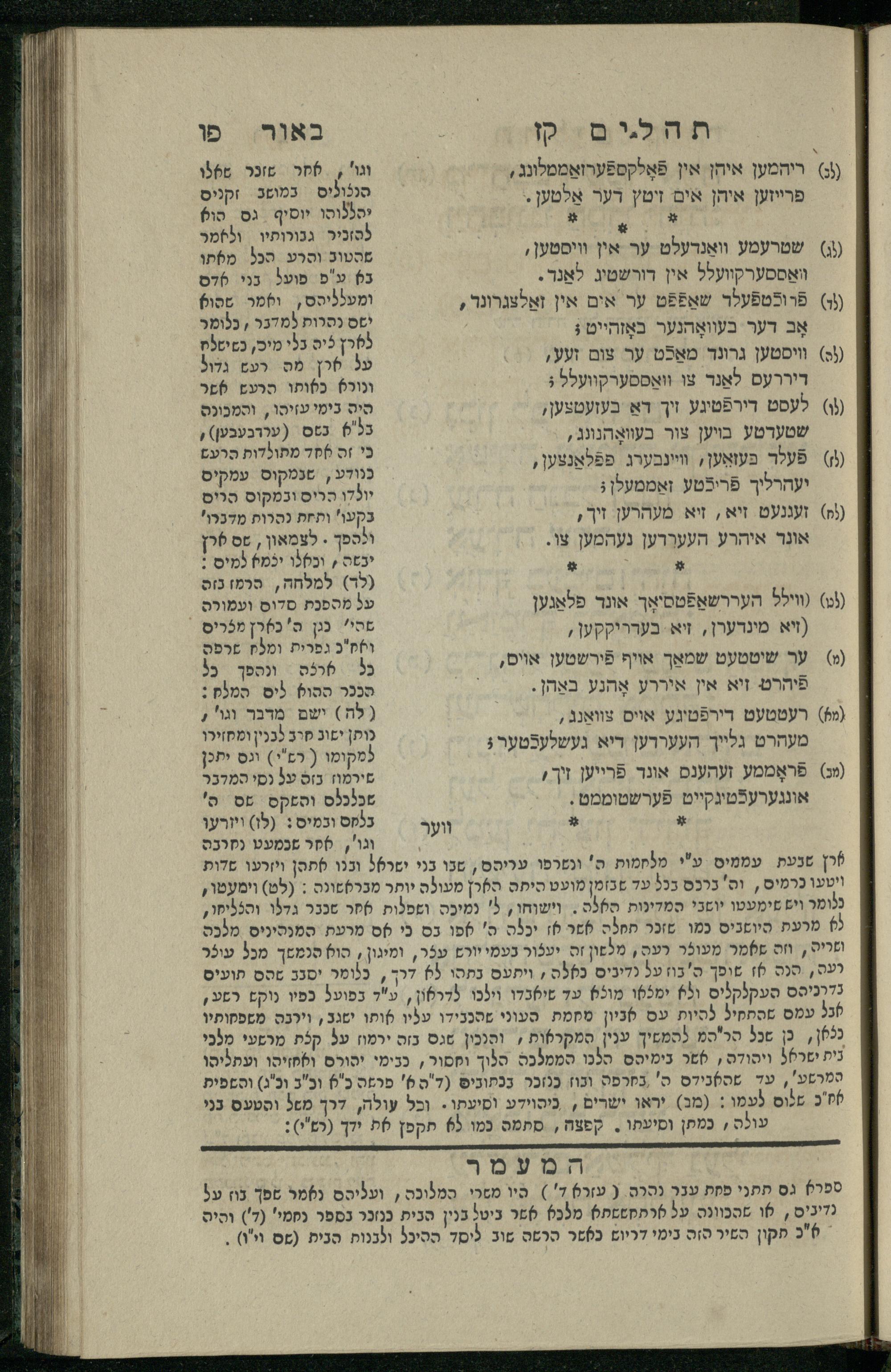 15 (1835) Sefer Tehilim / ʿim Perush Rashi ṿe-targum Ashkenazi me-et Rabenu Mosheh ben Menaḥem n.ʿE., u-veʾur me-et ha-ḥakham ha-mefursam R. Yoʾel Bril asher ḳara be-shem Zemirot Yiśraʾel, ṿe-nilṿeh elaṿ ha-Maʿamar me-et ha-ḥakham ha-medaḳdeḳ mo.h. Ṿolf Meʾir (moreh lashon ʿIvri be-vet ḥinukh ha-normali asher be-Prag), u-ve-tokho nikhlal haʿataḳah u-veʾur le-khol milot be-laʿaz ha-nimtsaʾot be-Fe. Rashi z.l. me-et ha-madpis Mosheh ha-Leṿi Landa15 (1835) ספר תהלים / עם פירוש רש''י ותרגום אשכנזי מאת רבינו משה בן מנחם נ"ע, ובאור מאת החכם המפורסם ר' יואל ברי"ל אשר קרא בשם זמירות ישראל, ונלוה אליו המעמר מאת החכם המדקדק מו"ה וואלף מאיר (מורה לשון עברי בבית חנוך הנארמאלי אשר בפראג), ובתוכו נכלל העתקה ובאור לכל מלות בלע"ז הנמצאות בפירש"י ז"ל מאת המדפיס משה הלוי לנדא