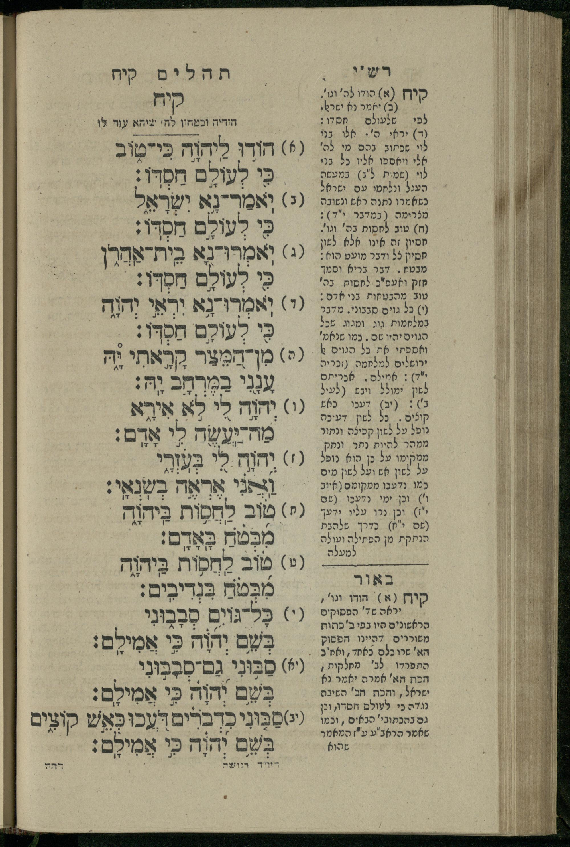 15 (1835) Sefer Tehilim / ʿim Perush Rashi ṿe-targum Ashkenazi me-et Rabenu Mosheh ben Menaḥem n.ʿE., u-veʾur me-et ha-ḥakham ha-mefursam R. Yoʾel Bril asher ḳara be-shem Zemirot Yiśraʾel, ṿe-nilṿeh elaṿ ha-Maʿamar me-et ha-ḥakham ha-medaḳdeḳ mo.h. Ṿolf Meʾir (moreh lashon ʿIvri be-vet ḥinukh ha-normali asher be-Prag), u-ve-tokho nikhlal haʿataḳah u-veʾur le-khol milot be-laʿaz ha-nimtsaʾot be-Fe. Rashi z.l. me-et ha-madpis Mosheh ha-Leṿi Landa15 (1835) ספר תהלים / עם פירוש רש''י ותרגום אשכנזי מאת רבינו משה בן מנחם נ"ע, ובאור מאת החכם המפורסם ר' יואל ברי"ל אשר קרא בשם זמירות ישראל, ונלוה אליו המעמר מאת החכם המדקדק מו"ה וואלף מאיר (מורה לשון עברי בבית חנוך הנארמאלי אשר בפראג), ובתוכו נכלל העתקה ובאור לכל מלות בלע"ז הנמצאות בפירש"י ז"ל מאת המדפיס משה הלוי לנדא