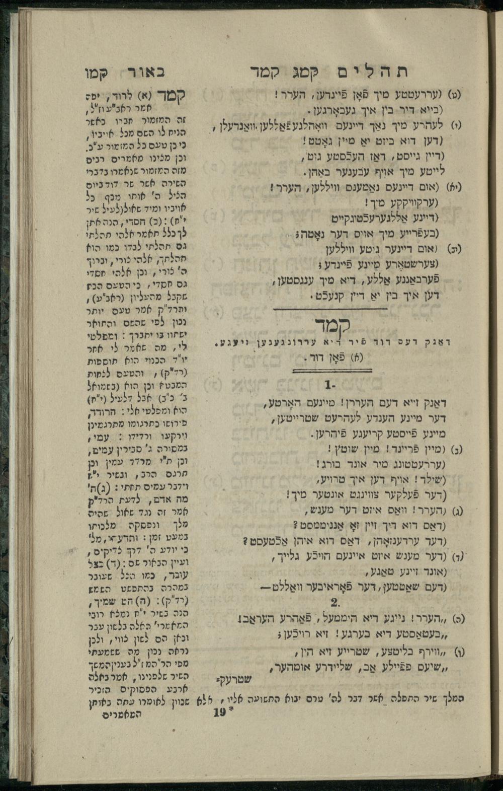 15 (1835) Sefer Tehilim / ʿim Perush Rashi ṿe-targum Ashkenazi me-et Rabenu Mosheh ben Menaḥem n.ʿE., u-veʾur me-et ha-ḥakham ha-mefursam R. Yoʾel Bril asher ḳara be-shem Zemirot Yiśraʾel, ṿe-nilṿeh elaṿ ha-Maʿamar me-et ha-ḥakham ha-medaḳdeḳ mo.h. Ṿolf Meʾir (moreh lashon ʿIvri be-vet ḥinukh ha-normali asher be-Prag), u-ve-tokho nikhlal haʿataḳah u-veʾur le-khol milot be-laʿaz ha-nimtsaʾot be-Fe. Rashi z.l. me-et ha-madpis Mosheh ha-Leṿi Landa15 (1835) ספר תהלים / עם פירוש רש''י ותרגום אשכנזי מאת רבינו משה בן מנחם נ"ע, ובאור מאת החכם המפורסם ר' יואל ברי"ל אשר קרא בשם זמירות ישראל, ונלוה אליו המעמר מאת החכם המדקדק מו"ה וואלף מאיר (מורה לשון עברי בבית חנוך הנארמאלי אשר בפראג), ובתוכו נכלל העתקה ובאור לכל מלות בלע"ז הנמצאות בפירש"י ז"ל מאת המדפיס משה הלוי לנדא