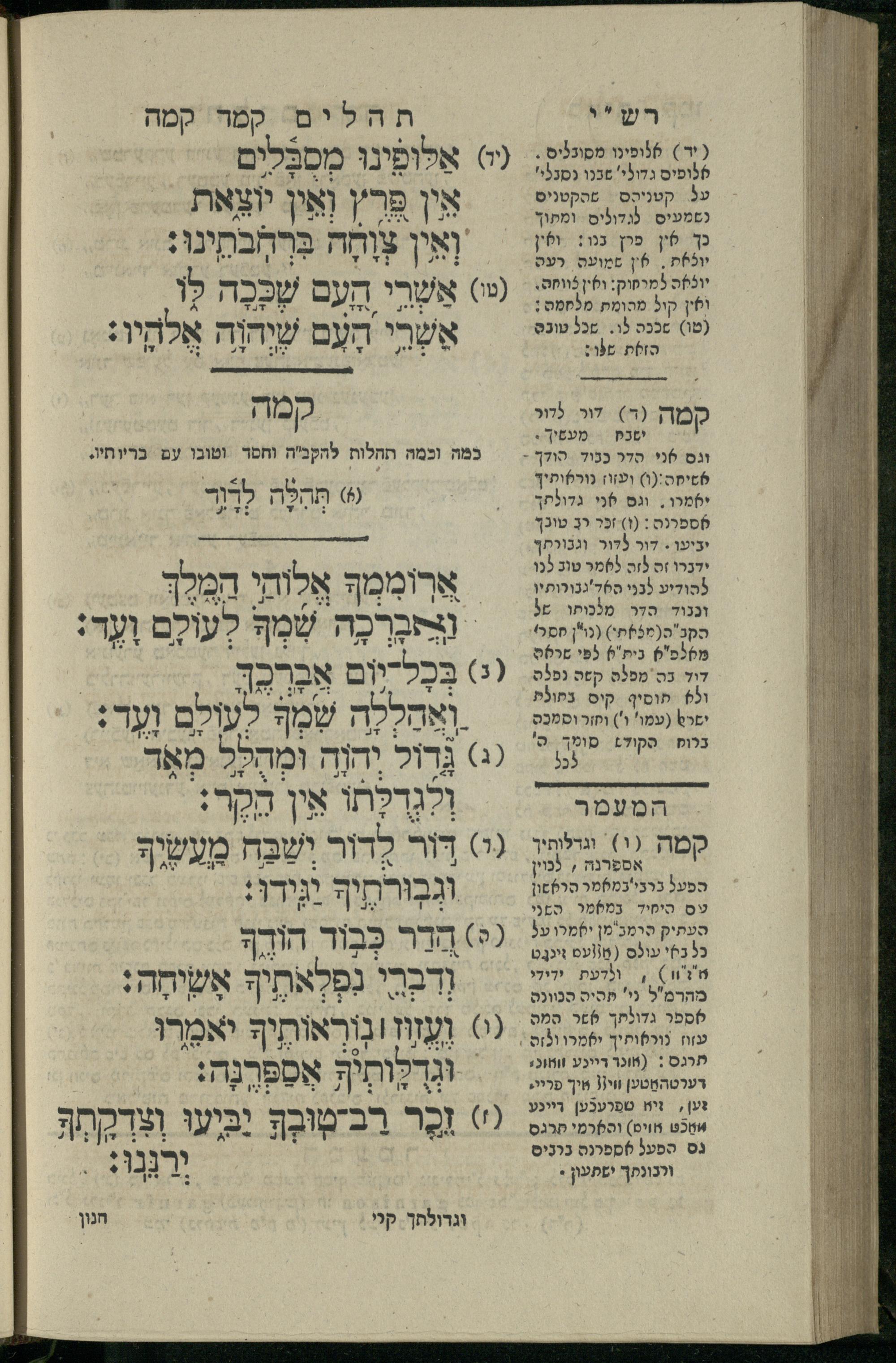 15 (1835) Sefer Tehilim / ʿim Perush Rashi ṿe-targum Ashkenazi me-et Rabenu Mosheh ben Menaḥem n.ʿE., u-veʾur me-et ha-ḥakham ha-mefursam R. Yoʾel Bril asher ḳara be-shem Zemirot Yiśraʾel, ṿe-nilṿeh elaṿ ha-Maʿamar me-et ha-ḥakham ha-medaḳdeḳ mo.h. Ṿolf Meʾir (moreh lashon ʿIvri be-vet ḥinukh ha-normali asher be-Prag), u-ve-tokho nikhlal haʿataḳah u-veʾur le-khol milot be-laʿaz ha-nimtsaʾot be-Fe. Rashi z.l. me-et ha-madpis Mosheh ha-Leṿi Landa15 (1835) ספר תהלים / עם פירוש רש''י ותרגום אשכנזי מאת רבינו משה בן מנחם נ"ע, ובאור מאת החכם המפורסם ר' יואל ברי"ל אשר קרא בשם זמירות ישראל, ונלוה אליו המעמר מאת החכם המדקדק מו"ה וואלף מאיר (מורה לשון עברי בבית חנוך הנארמאלי אשר בפראג), ובתוכו נכלל העתקה ובאור לכל מלות בלע"ז הנמצאות בפירש"י ז"ל מאת המדפיס משה הלוי לנדא