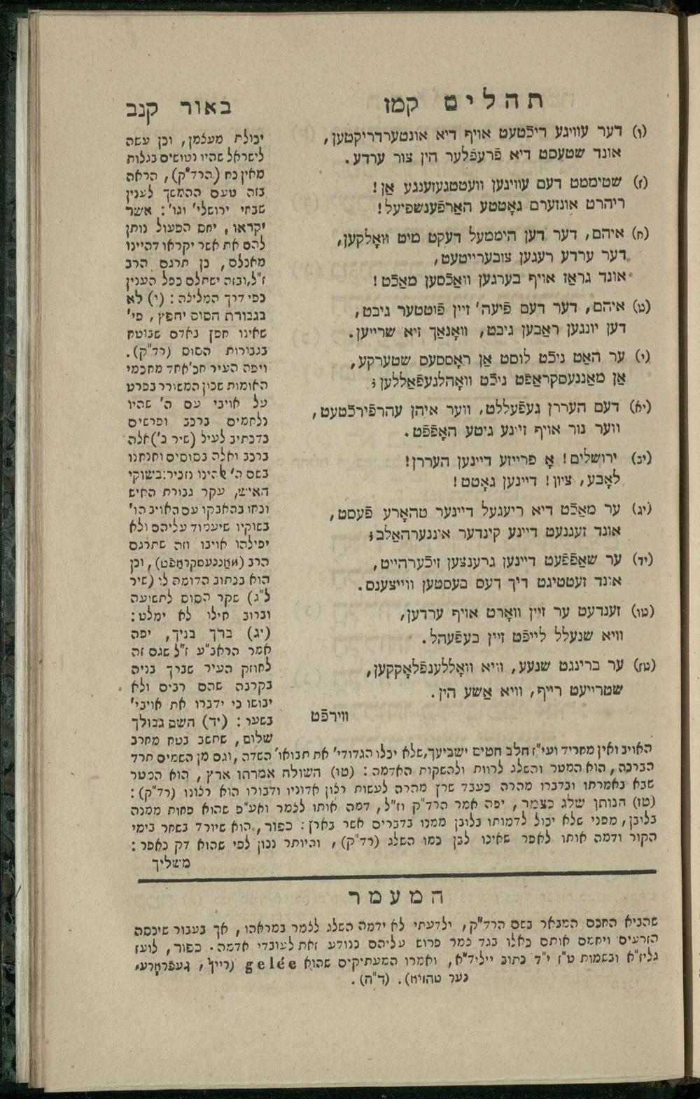 15 (1835) Sefer Tehilim / ʿim Perush Rashi ṿe-targum Ashkenazi me-et Rabenu Mosheh ben Menaḥem n.ʿE., u-veʾur me-et ha-ḥakham ha-mefursam R. Yoʾel Bril asher ḳara be-shem Zemirot Yiśraʾel, ṿe-nilṿeh elaṿ ha-Maʿamar me-et ha-ḥakham ha-medaḳdeḳ mo.h. Ṿolf Meʾir (moreh lashon ʿIvri be-vet ḥinukh ha-normali asher be-Prag), u-ve-tokho nikhlal haʿataḳah u-veʾur le-khol milot be-laʿaz ha-nimtsaʾot be-Fe. Rashi z.l. me-et ha-madpis Mosheh ha-Leṿi Landa15 (1835) ספר תהלים / עם פירוש רש''י ותרגום אשכנזי מאת רבינו משה בן מנחם נ"ע, ובאור מאת החכם המפורסם ר' יואל ברי"ל אשר קרא בשם זמירות ישראל, ונלוה אליו המעמר מאת החכם המדקדק מו"ה וואלף מאיר (מורה לשון עברי בבית חנוך הנארמאלי אשר בפראג), ובתוכו נכלל העתקה ובאור לכל מלות בלע"ז הנמצאות בפירש"י ז"ל מאת המדפיס משה הלוי לנדא