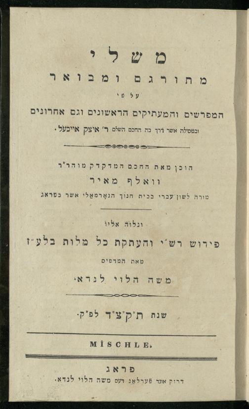 16 (1834) Mishle / meturgam u-mevoʾar ʿal pi ha-mefarshim ṿe-ha-maʿatiḳim ha-rishonim ṿe-gam aḥaronim u-ve-mesilah asher darakh bah ha-ḥakham ha-shalem R. Itsaḳ Aikhel, hukhan me-et ha-khaḥam ha-medaḳdeḳ m.v.h.r.r. Ṿolf Meʾir, moreh lashon ʿIvri be-vet ḥinukh ha-normali asher be-Prag, ṿe-nilṿeh elaṿ Perush Rashi ṿe-haʿtaḳat kol milot be-laʿaz me-et ha-madpis Mosheh ha-Leṿi Landa16 (1834) ספר תהלים / מתורגם ובמואר על פי המפרשים והמעתיקים הראשונים וגם אחרונים ובמסילה אשר דרך בה החכם השלם ר׳ איצק אייכעל, הוכן מאת החכם המדקדק מוהר״ר וואלף מאיר (מורה לשון עברי בבית חנוך הנארמאלי אשר בפראג), ונלוה אליו פירוש רש״י והעתקת כל מלות בלע״ז מאת המדפיס משה הלוי לנדא