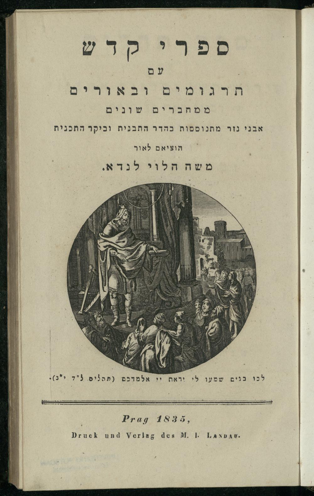 14 (1835) Sefer Tehilim : ʿim Perush Rashi ṿe-targum Ashkenazi me-et Rabenu Mosheh ben Menaḥem n.ʿE., u-veʾur me-et ha-ḥakham ha-mefursam R. Yoʾel Bril asher ḳara be-shem Zemirot Yiśraʾel, ṿe-nilṿeh elaṿ ha-Maʿamar me-et ha-ḥakham ha-medaḳdeḳ mo.h. Ṿolf Meʾir (moreh lashon ʿIvri be-vet ḥinukh ha-normali asher be-Prag), u-ve-tokho nikhlal haʿtaḳah u-veʾur le-khol milot be-laʿaz ha-nimtsaʾot be-Fe. Rashi z.l. / me-et ha-madpis Mosheh ha-Leṿi Landa14 (1835) ספר תהלים / עם פירוש רש״י ותרגום אשכנזי מאת רבינו משה בן מנחם נ״ע, ובאור מאת החכם המפורסם ר' יואל ברי״ל אשר קרא בשם זמירות ישראל, ונלוה אליו המעמר מאת החכם המדקדק מו״ה וואלף מאיר (מורה לשון עברי בבית חנוך הנארמאלי אשר בפראג), ובתוכו נכלל העתקה ובאור לכל מלות בלע״ז הנמצאות בפירש״י ז״ל מאת המדפיס משה הלוי לנדא