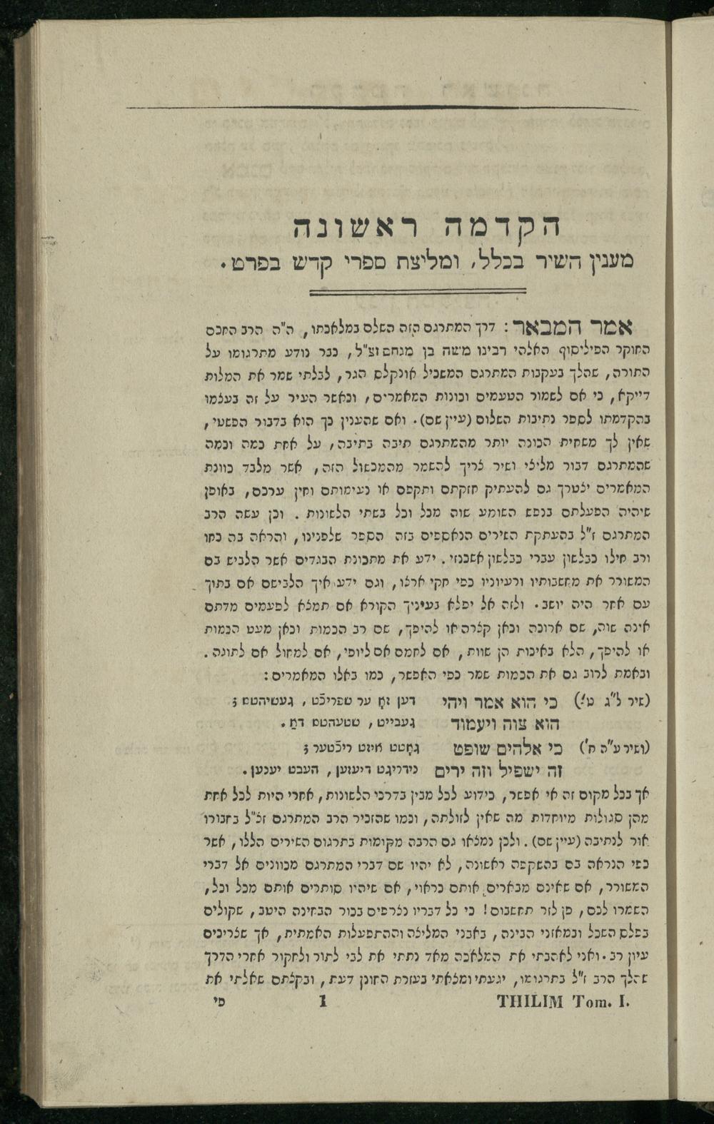 14 (1835) Sefer Tehilim : ʿim Perush Rashi ṿe-targum Ashkenazi me-et Rabenu Mosheh ben Menaḥem n.ʿE., u-veʾur me-et ha-ḥakham ha-mefursam R. Yoʾel Bril asher ḳara be-shem Zemirot Yiśraʾel, ṿe-nilṿeh elaṿ ha-Maʿamar me-et ha-ḥakham ha-medaḳdeḳ mo.h. Ṿolf Meʾir (moreh lashon ʿIvri be-vet ḥinukh ha-normali asher be-Prag), u-ve-tokho nikhlal haʿtaḳah u-veʾur le-khol milot be-laʿaz ha-nimtsaʾot be-Fe. Rashi z.l. / me-et ha-madpis Mosheh ha-Leṿi Landa14 (1835) ספר תהלים / עם פירוש רש״י ותרגום אשכנזי מאת רבינו משה בן מנחם נ״ע, ובאור מאת החכם המפורסם ר' יואל ברי״ל אשר קרא בשם זמירות ישראל, ונלוה אליו המעמר מאת החכם המדקדק מו״ה וואלף מאיר (מורה לשון עברי בבית חנוך הנארמאלי אשר בפראג), ובתוכו נכלל העתקה ובאור לכל מלות בלע״ז הנמצאות בפירש״י ז״ל מאת המדפיס משה הלוי לנדא