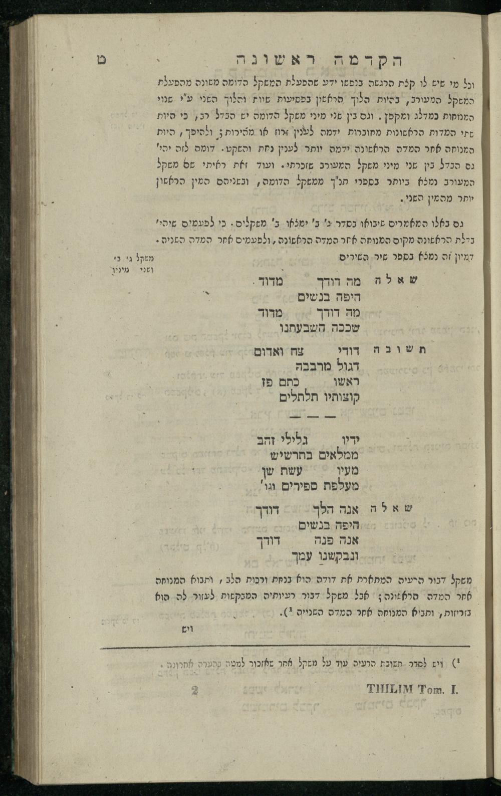 14 (1835) Sefer Tehilim : ʿim Perush Rashi ṿe-targum Ashkenazi me-et Rabenu Mosheh ben Menaḥem n.ʿE., u-veʾur me-et ha-ḥakham ha-mefursam R. Yoʾel Bril asher ḳara be-shem Zemirot Yiśraʾel, ṿe-nilṿeh elaṿ ha-Maʿamar me-et ha-ḥakham ha-medaḳdeḳ mo.h. Ṿolf Meʾir (moreh lashon ʿIvri be-vet ḥinukh ha-normali asher be-Prag), u-ve-tokho nikhlal haʿtaḳah u-veʾur le-khol milot be-laʿaz ha-nimtsaʾot be-Fe. Rashi z.l. / me-et ha-madpis Mosheh ha-Leṿi Landa14 (1835) ספר תהלים / עם פירוש רש״י ותרגום אשכנזי מאת רבינו משה בן מנחם נ״ע, ובאור מאת החכם המפורסם ר' יואל ברי״ל אשר קרא בשם זמירות ישראל, ונלוה אליו המעמר מאת החכם המדקדק מו״ה וואלף מאיר (מורה לשון עברי בבית חנוך הנארמאלי אשר בפראג), ובתוכו נכלל העתקה ובאור לכל מלות בלע״ז הנמצאות בפירש״י ז״ל מאת המדפיס משה הלוי לנדא