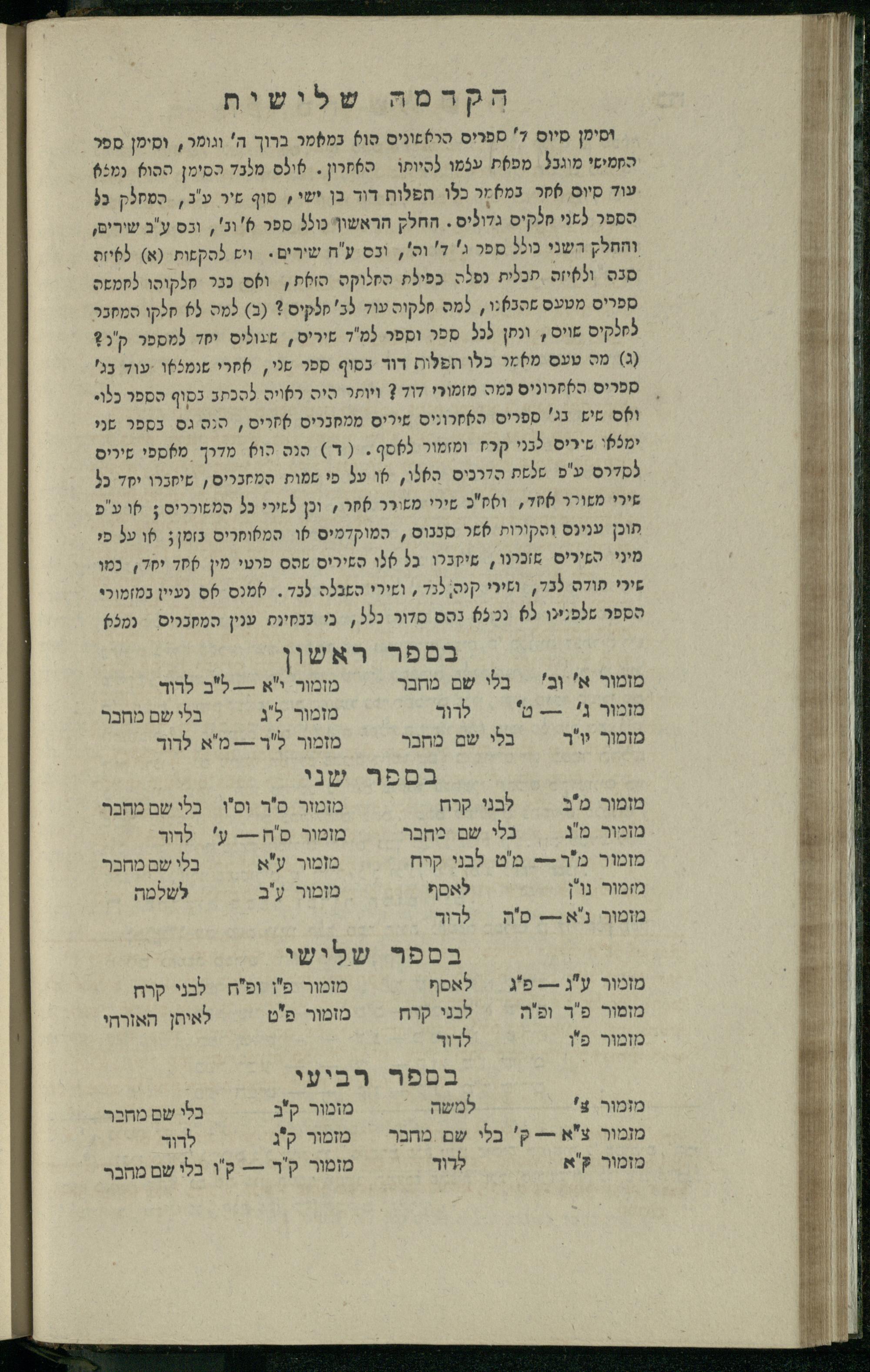 14 (1835) Sefer Tehilim : ʿim Perush Rashi ṿe-targum Ashkenazi me-et Rabenu Mosheh ben Menaḥem n.ʿE., u-veʾur me-et ha-ḥakham ha-mefursam R. Yoʾel Bril asher ḳara be-shem Zemirot Yiśraʾel, ṿe-nilṿeh elaṿ ha-Maʿamar me-et ha-ḥakham ha-medaḳdeḳ mo.h. Ṿolf Meʾir (moreh lashon ʿIvri be-vet ḥinukh ha-normali asher be-Prag), u-ve-tokho nikhlal haʿtaḳah u-veʾur le-khol milot be-laʿaz ha-nimtsaʾot be-Fe. Rashi z.l. / me-et ha-madpis Mosheh ha-Leṿi Landa14 (1835) ספר תהלים / עם פירוש רש״י ותרגום אשכנזי מאת רבינו משה בן מנחם נ״ע, ובאור מאת החכם המפורסם ר' יואל ברי״ל אשר קרא בשם זמירות ישראל, ונלוה אליו המעמר מאת החכם המדקדק מו״ה וואלף מאיר (מורה לשון עברי בבית חנוך הנארמאלי אשר בפראג), ובתוכו נכלל העתקה ובאור לכל מלות בלע״ז הנמצאות בפירש״י ז״ל מאת המדפיס משה הלוי לנדא