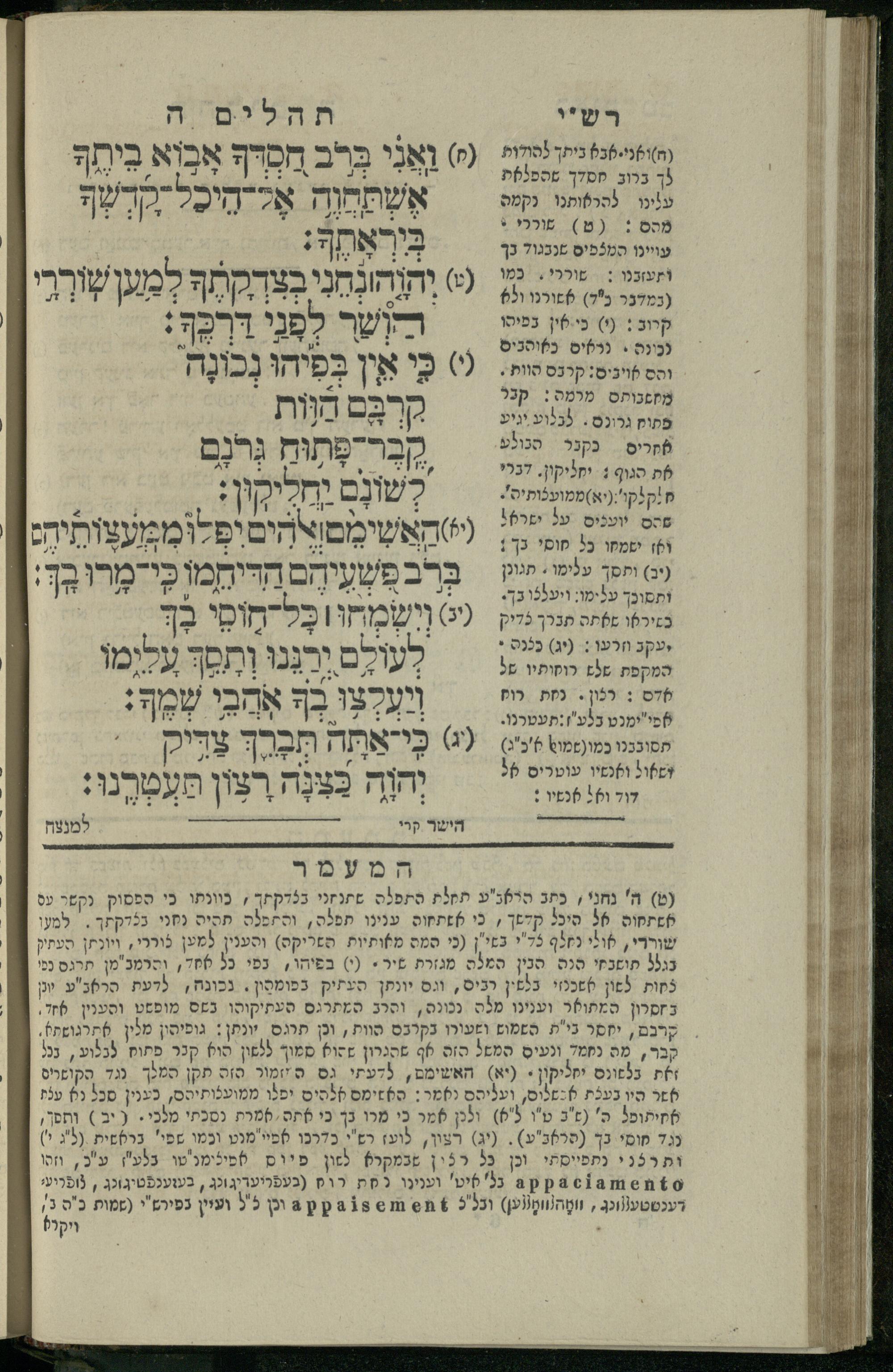 14 (1835) Sefer Tehilim : ʿim Perush Rashi ṿe-targum Ashkenazi me-et Rabenu Mosheh ben Menaḥem n.ʿE., u-veʾur me-et ha-ḥakham ha-mefursam R. Yoʾel Bril asher ḳara be-shem Zemirot Yiśraʾel, ṿe-nilṿeh elaṿ ha-Maʿamar me-et ha-ḥakham ha-medaḳdeḳ mo.h. Ṿolf Meʾir (moreh lashon ʿIvri be-vet ḥinukh ha-normali asher be-Prag), u-ve-tokho nikhlal haʿtaḳah u-veʾur le-khol milot be-laʿaz ha-nimtsaʾot be-Fe. Rashi z.l. / me-et ha-madpis Mosheh ha-Leṿi Landa14 (1835) ספר תהלים / עם פירוש רש״י ותרגום אשכנזי מאת רבינו משה בן מנחם נ״ע, ובאור מאת החכם המפורסם ר' יואל ברי״ל אשר קרא בשם זמירות ישראל, ונלוה אליו המעמר מאת החכם המדקדק מו״ה וואלף מאיר (מורה לשון עברי בבית חנוך הנארמאלי אשר בפראג), ובתוכו נכלל העתקה ובאור לכל מלות בלע״ז הנמצאות בפירש״י ז״ל מאת המדפיס משה הלוי לנדא