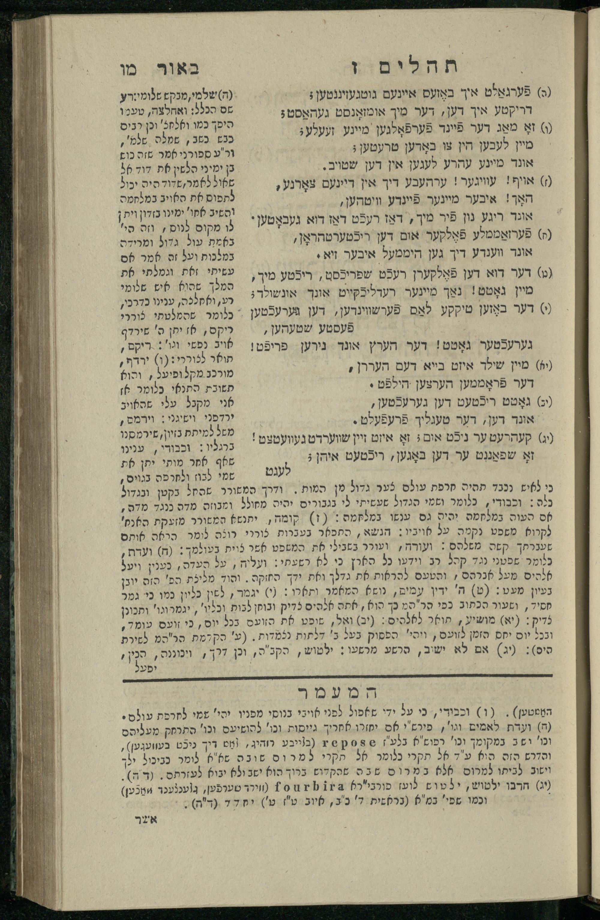 14 (1835) Sefer Tehilim : ʿim Perush Rashi ṿe-targum Ashkenazi me-et Rabenu Mosheh ben Menaḥem n.ʿE., u-veʾur me-et ha-ḥakham ha-mefursam R. Yoʾel Bril asher ḳara be-shem Zemirot Yiśraʾel, ṿe-nilṿeh elaṿ ha-Maʿamar me-et ha-ḥakham ha-medaḳdeḳ mo.h. Ṿolf Meʾir (moreh lashon ʿIvri be-vet ḥinukh ha-normali asher be-Prag), u-ve-tokho nikhlal haʿtaḳah u-veʾur le-khol milot be-laʿaz ha-nimtsaʾot be-Fe. Rashi z.l. / me-et ha-madpis Mosheh ha-Leṿi Landa14 (1835) ספר תהלים / עם פירוש רש״י ותרגום אשכנזי מאת רבינו משה בן מנחם נ״ע, ובאור מאת החכם המפורסם ר' יואל ברי״ל אשר קרא בשם זמירות ישראל, ונלוה אליו המעמר מאת החכם המדקדק מו״ה וואלף מאיר (מורה לשון עברי בבית חנוך הנארמאלי אשר בפראג), ובתוכו נכלל העתקה ובאור לכל מלות בלע״ז הנמצאות בפירש״י ז״ל מאת המדפיס משה הלוי לנדא