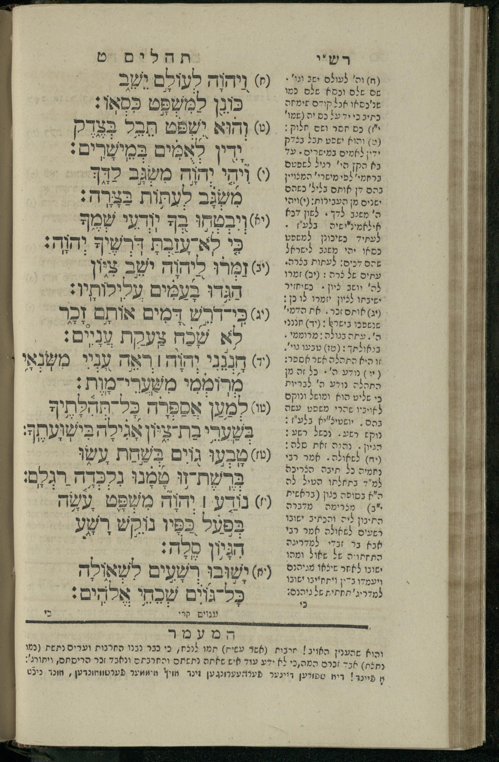 14 (1835) Sefer Tehilim : ʿim Perush Rashi ṿe-targum Ashkenazi me-et Rabenu Mosheh ben Menaḥem n.ʿE., u-veʾur me-et ha-ḥakham ha-mefursam R. Yoʾel Bril asher ḳara be-shem Zemirot Yiśraʾel, ṿe-nilṿeh elaṿ ha-Maʿamar me-et ha-ḥakham ha-medaḳdeḳ mo.h. Ṿolf Meʾir (moreh lashon ʿIvri be-vet ḥinukh ha-normali asher be-Prag), u-ve-tokho nikhlal haʿtaḳah u-veʾur le-khol milot be-laʿaz ha-nimtsaʾot be-Fe. Rashi z.l. / me-et ha-madpis Mosheh ha-Leṿi Landa14 (1835) ספר תהלים / עם פירוש רש״י ותרגום אשכנזי מאת רבינו משה בן מנחם נ״ע, ובאור מאת החכם המפורסם ר' יואל ברי״ל אשר קרא בשם זמירות ישראל, ונלוה אליו המעמר מאת החכם המדקדק מו״ה וואלף מאיר (מורה לשון עברי בבית חנוך הנארמאלי אשר בפראג), ובתוכו נכלל העתקה ובאור לכל מלות בלע״ז הנמצאות בפירש״י ז״ל מאת המדפיס משה הלוי לנדא