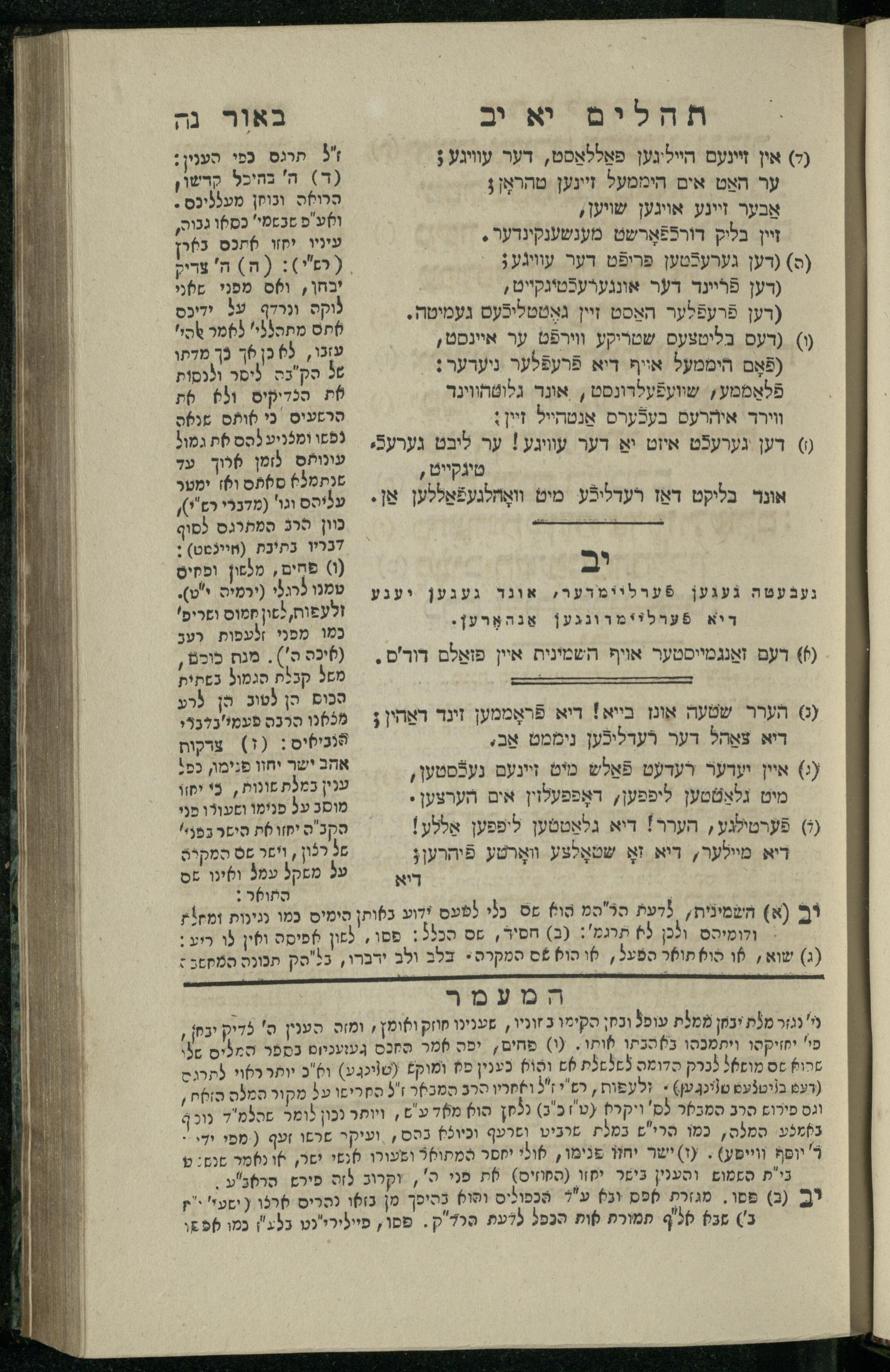 14 (1835) Sefer Tehilim : ʿim Perush Rashi ṿe-targum Ashkenazi me-et Rabenu Mosheh ben Menaḥem n.ʿE., u-veʾur me-et ha-ḥakham ha-mefursam R. Yoʾel Bril asher ḳara be-shem Zemirot Yiśraʾel, ṿe-nilṿeh elaṿ ha-Maʿamar me-et ha-ḥakham ha-medaḳdeḳ mo.h. Ṿolf Meʾir (moreh lashon ʿIvri be-vet ḥinukh ha-normali asher be-Prag), u-ve-tokho nikhlal haʿtaḳah u-veʾur le-khol milot be-laʿaz ha-nimtsaʾot be-Fe. Rashi z.l. / me-et ha-madpis Mosheh ha-Leṿi Landa14 (1835) ספר תהלים / עם פירוש רש״י ותרגום אשכנזי מאת רבינו משה בן מנחם נ״ע, ובאור מאת החכם המפורסם ר' יואל ברי״ל אשר קרא בשם זמירות ישראל, ונלוה אליו המעמר מאת החכם המדקדק מו״ה וואלף מאיר (מורה לשון עברי בבית חנוך הנארמאלי אשר בפראג), ובתוכו נכלל העתקה ובאור לכל מלות בלע״ז הנמצאות בפירש״י ז״ל מאת המדפיס משה הלוי לנדא