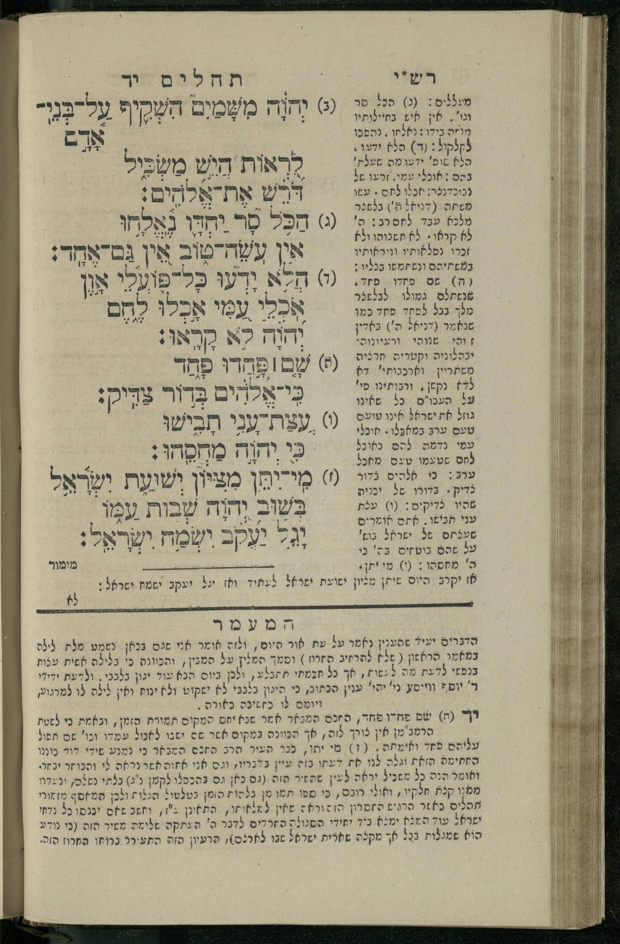 14 (1835) Sefer Tehilim : ʿim Perush Rashi ṿe-targum Ashkenazi me-et Rabenu Mosheh ben Menaḥem n.ʿE., u-veʾur me-et ha-ḥakham ha-mefursam R. Yoʾel Bril asher ḳara be-shem Zemirot Yiśraʾel, ṿe-nilṿeh elaṿ ha-Maʿamar me-et ha-ḥakham ha-medaḳdeḳ mo.h. Ṿolf Meʾir (moreh lashon ʿIvri be-vet ḥinukh ha-normali asher be-Prag), u-ve-tokho nikhlal haʿtaḳah u-veʾur le-khol milot be-laʿaz ha-nimtsaʾot be-Fe. Rashi z.l. / me-et ha-madpis Mosheh ha-Leṿi Landa14 (1835) ספר תהלים / עם פירוש רש״י ותרגום אשכנזי מאת רבינו משה בן מנחם נ״ע, ובאור מאת החכם המפורסם ר' יואל ברי״ל אשר קרא בשם זמירות ישראל, ונלוה אליו המעמר מאת החכם המדקדק מו״ה וואלף מאיר (מורה לשון עברי בבית חנוך הנארמאלי אשר בפראג), ובתוכו נכלל העתקה ובאור לכל מלות בלע״ז הנמצאות בפירש״י ז״ל מאת המדפיס משה הלוי לנדא