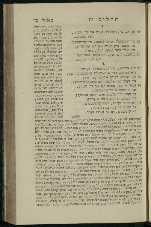 14 (1835) Sefer Tehilim : ʿim Perush Rashi ṿe-targum Ashkenazi me-et Rabenu Mosheh ben Menaḥem n.ʿE., u-veʾur me-et ha-ḥakham ha-mefursam R. Yoʾel Bril asher ḳara be-shem Zemirot Yiśraʾel, ṿe-nilṿeh elaṿ ha-Maʿamar me-et ha-ḥakham ha-medaḳdeḳ mo.h. Ṿolf Meʾir (moreh lashon ʿIvri be-vet ḥinukh ha-normali asher be-Prag), u-ve-tokho nikhlal haʿtaḳah u-veʾur le-khol milot be-laʿaz ha-nimtsaʾot be-Fe. Rashi z.l. / me-et ha-madpis Mosheh ha-Leṿi Landa14 (1835) ספר תהלים / עם פירוש רש״י ותרגום אשכנזי מאת רבינו משה בן מנחם נ״ע, ובאור מאת החכם המפורסם ר' יואל ברי״ל אשר קרא בשם זמירות ישראל, ונלוה אליו המעמר מאת החכם המדקדק מו״ה וואלף מאיר (מורה לשון עברי בבית חנוך הנארמאלי אשר בפראג), ובתוכו נכלל העתקה ובאור לכל מלות בלע״ז הנמצאות בפירש״י ז״ל מאת המדפיס משה הלוי לנדא