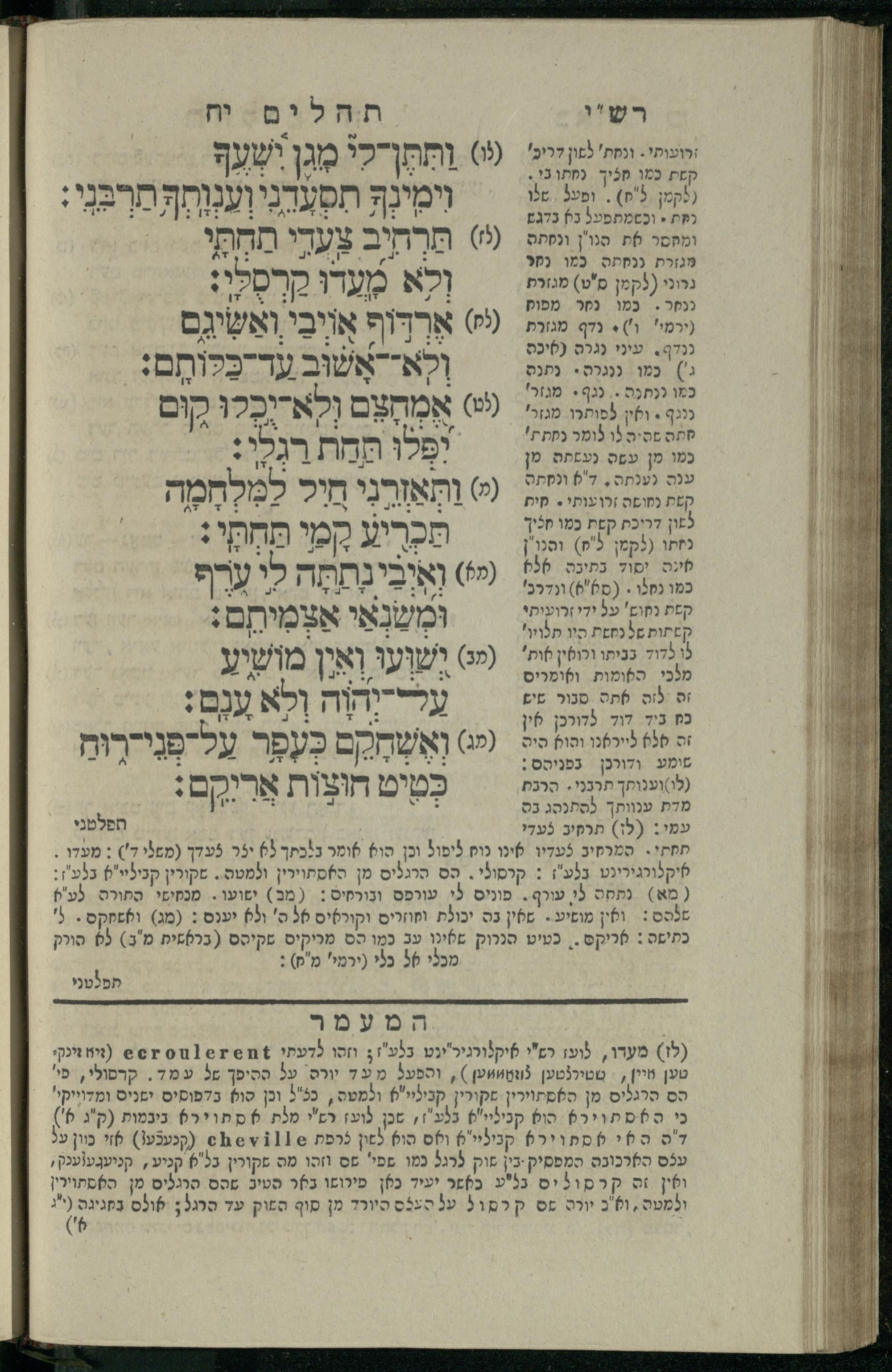 14 (1835) Sefer Tehilim : ʿim Perush Rashi ṿe-targum Ashkenazi me-et Rabenu Mosheh ben Menaḥem n.ʿE., u-veʾur me-et ha-ḥakham ha-mefursam R. Yoʾel Bril asher ḳara be-shem Zemirot Yiśraʾel, ṿe-nilṿeh elaṿ ha-Maʿamar me-et ha-ḥakham ha-medaḳdeḳ mo.h. Ṿolf Meʾir (moreh lashon ʿIvri be-vet ḥinukh ha-normali asher be-Prag), u-ve-tokho nikhlal haʿtaḳah u-veʾur le-khol milot be-laʿaz ha-nimtsaʾot be-Fe. Rashi z.l. / me-et ha-madpis Mosheh ha-Leṿi Landa14 (1835) ספר תהלים / עם פירוש רש״י ותרגום אשכנזי מאת רבינו משה בן מנחם נ״ע, ובאור מאת החכם המפורסם ר' יואל ברי״ל אשר קרא בשם זמירות ישראל, ונלוה אליו המעמר מאת החכם המדקדק מו״ה וואלף מאיר (מורה לשון עברי בבית חנוך הנארמאלי אשר בפראג), ובתוכו נכלל העתקה ובאור לכל מלות בלע״ז הנמצאות בפירש״י ז״ל מאת המדפיס משה הלוי לנדא