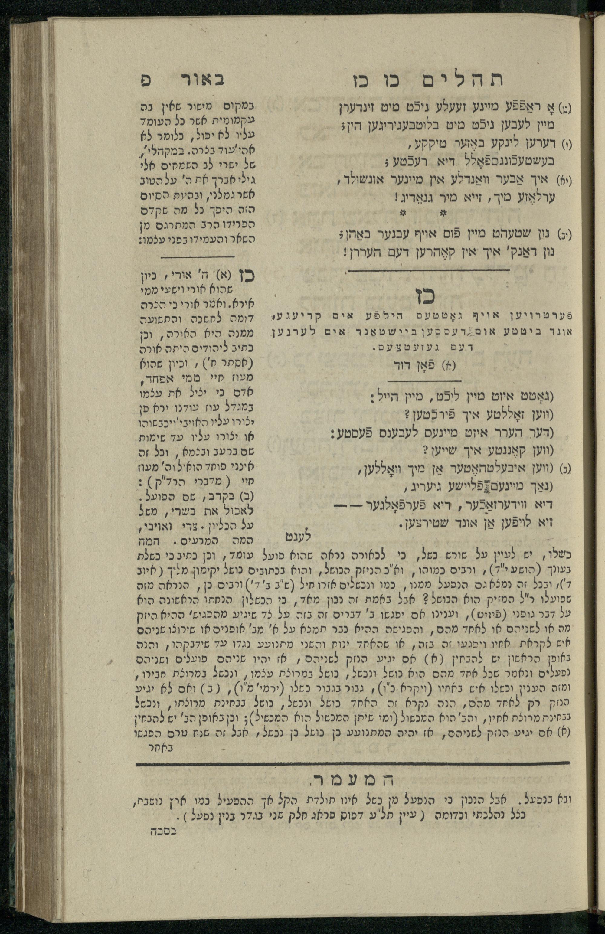 14 (1835) Sefer Tehilim : ʿim Perush Rashi ṿe-targum Ashkenazi me-et Rabenu Mosheh ben Menaḥem n.ʿE., u-veʾur me-et ha-ḥakham ha-mefursam R. Yoʾel Bril asher ḳara be-shem Zemirot Yiśraʾel, ṿe-nilṿeh elaṿ ha-Maʿamar me-et ha-ḥakham ha-medaḳdeḳ mo.h. Ṿolf Meʾir (moreh lashon ʿIvri be-vet ḥinukh ha-normali asher be-Prag), u-ve-tokho nikhlal haʿtaḳah u-veʾur le-khol milot be-laʿaz ha-nimtsaʾot be-Fe. Rashi z.l. / me-et ha-madpis Mosheh ha-Leṿi Landa14 (1835) ספר תהלים / עם פירוש רש״י ותרגום אשכנזי מאת רבינו משה בן מנחם נ״ע, ובאור מאת החכם המפורסם ר' יואל ברי״ל אשר קרא בשם זמירות ישראל, ונלוה אליו המעמר מאת החכם המדקדק מו״ה וואלף מאיר (מורה לשון עברי בבית חנוך הנארמאלי אשר בפראג), ובתוכו נכלל העתקה ובאור לכל מלות בלע״ז הנמצאות בפירש״י ז״ל מאת המדפיס משה הלוי לנדא