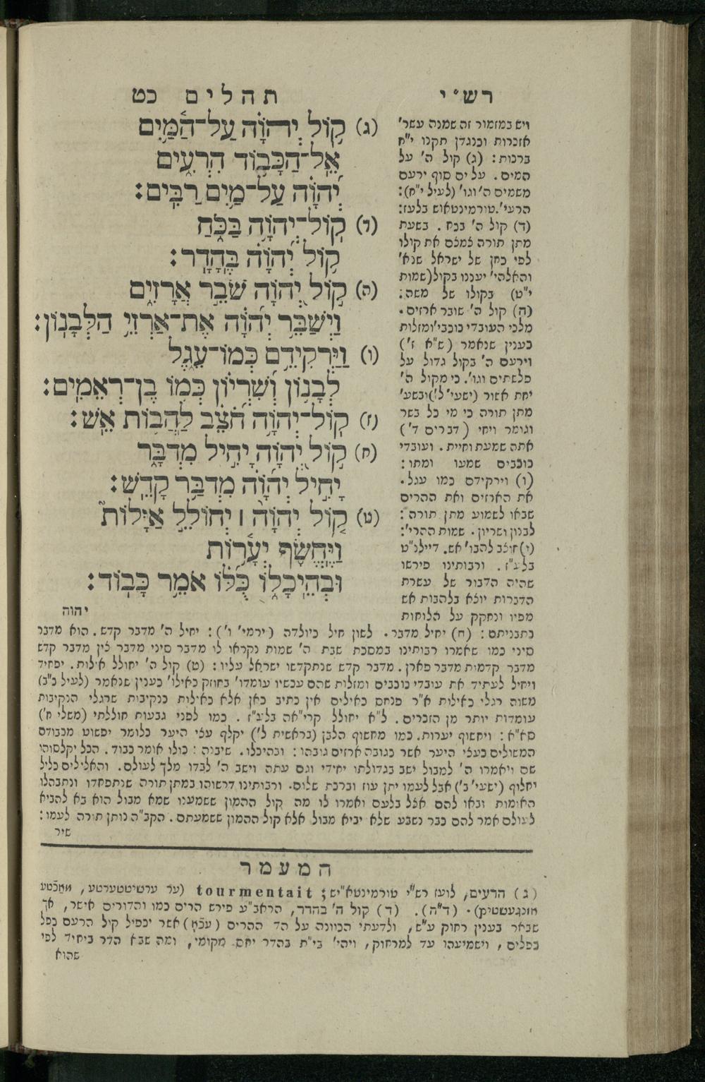 14 (1835) Sefer Tehilim : ʿim Perush Rashi ṿe-targum Ashkenazi me-et Rabenu Mosheh ben Menaḥem n.ʿE., u-veʾur me-et ha-ḥakham ha-mefursam R. Yoʾel Bril asher ḳara be-shem Zemirot Yiśraʾel, ṿe-nilṿeh elaṿ ha-Maʿamar me-et ha-ḥakham ha-medaḳdeḳ mo.h. Ṿolf Meʾir (moreh lashon ʿIvri be-vet ḥinukh ha-normali asher be-Prag), u-ve-tokho nikhlal haʿtaḳah u-veʾur le-khol milot be-laʿaz ha-nimtsaʾot be-Fe. Rashi z.l. / me-et ha-madpis Mosheh ha-Leṿi Landa14 (1835) ספר תהלים / עם פירוש רש״י ותרגום אשכנזי מאת רבינו משה בן מנחם נ״ע, ובאור מאת החכם המפורסם ר' יואל ברי״ל אשר קרא בשם זמירות ישראל, ונלוה אליו המעמר מאת החכם המדקדק מו״ה וואלף מאיר (מורה לשון עברי בבית חנוך הנארמאלי אשר בפראג), ובתוכו נכלל העתקה ובאור לכל מלות בלע״ז הנמצאות בפירש״י ז״ל מאת המדפיס משה הלוי לנדא