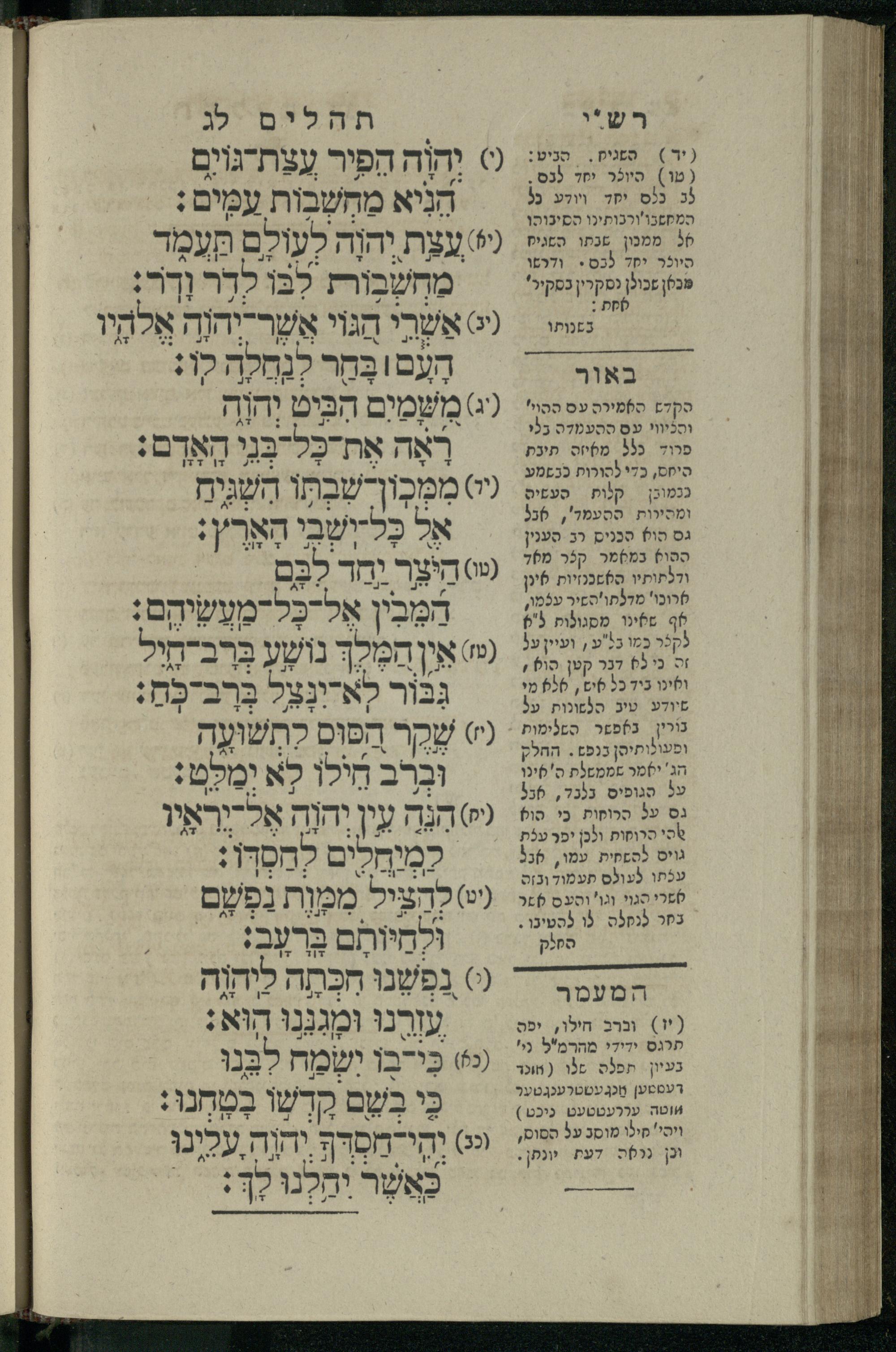 14 (1835) Sefer Tehilim : ʿim Perush Rashi ṿe-targum Ashkenazi me-et Rabenu Mosheh ben Menaḥem n.ʿE., u-veʾur me-et ha-ḥakham ha-mefursam R. Yoʾel Bril asher ḳara be-shem Zemirot Yiśraʾel, ṿe-nilṿeh elaṿ ha-Maʿamar me-et ha-ḥakham ha-medaḳdeḳ mo.h. Ṿolf Meʾir (moreh lashon ʿIvri be-vet ḥinukh ha-normali asher be-Prag), u-ve-tokho nikhlal haʿtaḳah u-veʾur le-khol milot be-laʿaz ha-nimtsaʾot be-Fe. Rashi z.l. / me-et ha-madpis Mosheh ha-Leṿi Landa14 (1835) ספר תהלים / עם פירוש רש״י ותרגום אשכנזי מאת רבינו משה בן מנחם נ״ע, ובאור מאת החכם המפורסם ר' יואל ברי״ל אשר קרא בשם זמירות ישראל, ונלוה אליו המעמר מאת החכם המדקדק מו״ה וואלף מאיר (מורה לשון עברי בבית חנוך הנארמאלי אשר בפראג), ובתוכו נכלל העתקה ובאור לכל מלות בלע״ז הנמצאות בפירש״י ז״ל מאת המדפיס משה הלוי לנדא