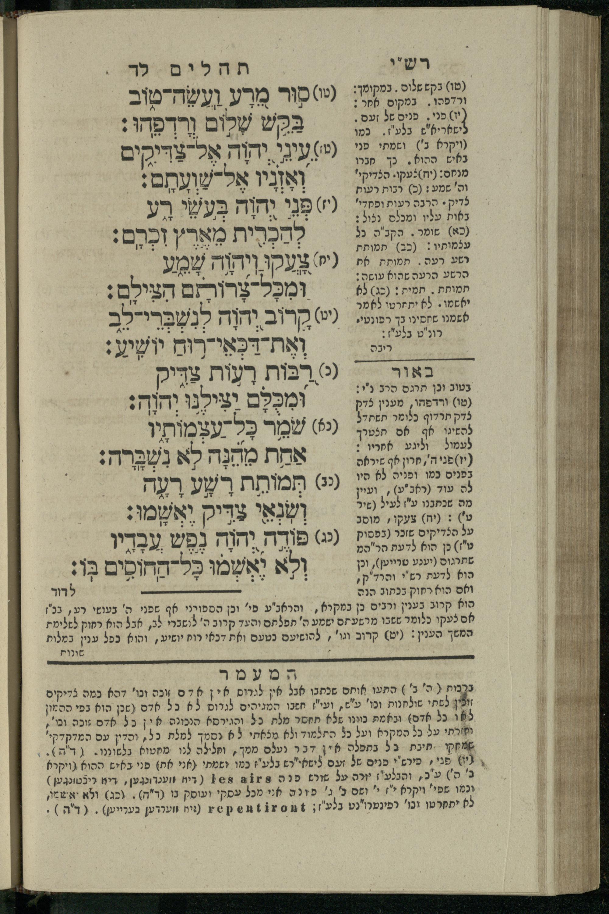 14 (1835) Sefer Tehilim : ʿim Perush Rashi ṿe-targum Ashkenazi me-et Rabenu Mosheh ben Menaḥem n.ʿE., u-veʾur me-et ha-ḥakham ha-mefursam R. Yoʾel Bril asher ḳara be-shem Zemirot Yiśraʾel, ṿe-nilṿeh elaṿ ha-Maʿamar me-et ha-ḥakham ha-medaḳdeḳ mo.h. Ṿolf Meʾir (moreh lashon ʿIvri be-vet ḥinukh ha-normali asher be-Prag), u-ve-tokho nikhlal haʿtaḳah u-veʾur le-khol milot be-laʿaz ha-nimtsaʾot be-Fe. Rashi z.l. / me-et ha-madpis Mosheh ha-Leṿi Landa14 (1835) ספר תהלים / עם פירוש רש״י ותרגום אשכנזי מאת רבינו משה בן מנחם נ״ע, ובאור מאת החכם המפורסם ר' יואל ברי״ל אשר קרא בשם זמירות ישראל, ונלוה אליו המעמר מאת החכם המדקדק מו״ה וואלף מאיר (מורה לשון עברי בבית חנוך הנארמאלי אשר בפראג), ובתוכו נכלל העתקה ובאור לכל מלות בלע״ז הנמצאות בפירש״י ז״ל מאת המדפיס משה הלוי לנדא