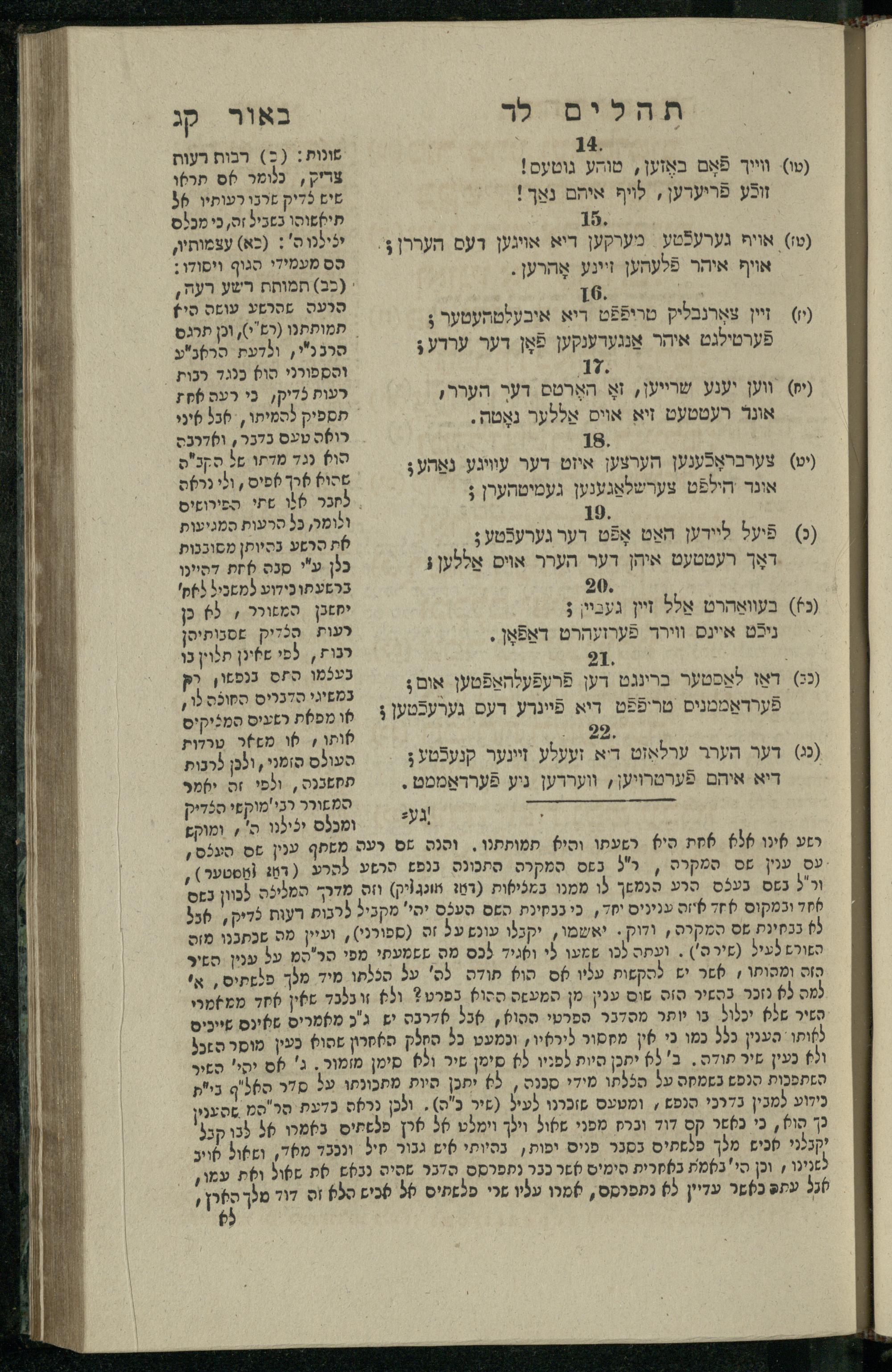 14 (1835) Sefer Tehilim : ʿim Perush Rashi ṿe-targum Ashkenazi me-et Rabenu Mosheh ben Menaḥem n.ʿE., u-veʾur me-et ha-ḥakham ha-mefursam R. Yoʾel Bril asher ḳara be-shem Zemirot Yiśraʾel, ṿe-nilṿeh elaṿ ha-Maʿamar me-et ha-ḥakham ha-medaḳdeḳ mo.h. Ṿolf Meʾir (moreh lashon ʿIvri be-vet ḥinukh ha-normali asher be-Prag), u-ve-tokho nikhlal haʿtaḳah u-veʾur le-khol milot be-laʿaz ha-nimtsaʾot be-Fe. Rashi z.l. / me-et ha-madpis Mosheh ha-Leṿi Landa14 (1835) ספר תהלים / עם פירוש רש״י ותרגום אשכנזי מאת רבינו משה בן מנחם נ״ע, ובאור מאת החכם המפורסם ר' יואל ברי״ל אשר קרא בשם זמירות ישראל, ונלוה אליו המעמר מאת החכם המדקדק מו״ה וואלף מאיר (מורה לשון עברי בבית חנוך הנארמאלי אשר בפראג), ובתוכו נכלל העתקה ובאור לכל מלות בלע״ז הנמצאות בפירש״י ז״ל מאת המדפיס משה הלוי לנדא