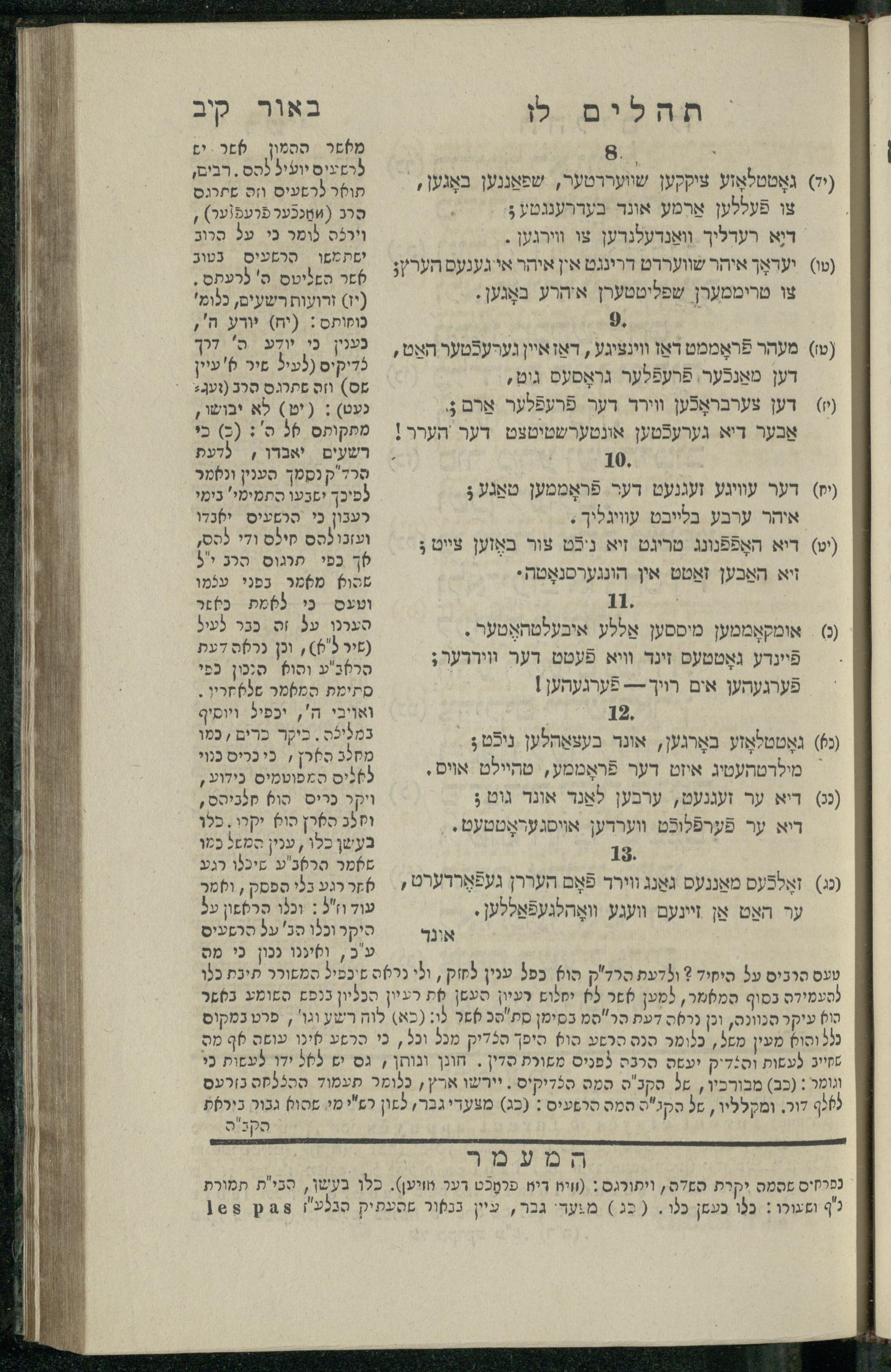 14 (1835) Sefer Tehilim : ʿim Perush Rashi ṿe-targum Ashkenazi me-et Rabenu Mosheh ben Menaḥem n.ʿE., u-veʾur me-et ha-ḥakham ha-mefursam R. Yoʾel Bril asher ḳara be-shem Zemirot Yiśraʾel, ṿe-nilṿeh elaṿ ha-Maʿamar me-et ha-ḥakham ha-medaḳdeḳ mo.h. Ṿolf Meʾir (moreh lashon ʿIvri be-vet ḥinukh ha-normali asher be-Prag), u-ve-tokho nikhlal haʿtaḳah u-veʾur le-khol milot be-laʿaz ha-nimtsaʾot be-Fe. Rashi z.l. / me-et ha-madpis Mosheh ha-Leṿi Landa14 (1835) ספר תהלים / עם פירוש רש״י ותרגום אשכנזי מאת רבינו משה בן מנחם נ״ע, ובאור מאת החכם המפורסם ר' יואל ברי״ל אשר קרא בשם זמירות ישראל, ונלוה אליו המעמר מאת החכם המדקדק מו״ה וואלף מאיר (מורה לשון עברי בבית חנוך הנארמאלי אשר בפראג), ובתוכו נכלל העתקה ובאור לכל מלות בלע״ז הנמצאות בפירש״י ז״ל מאת המדפיס משה הלוי לנדא
