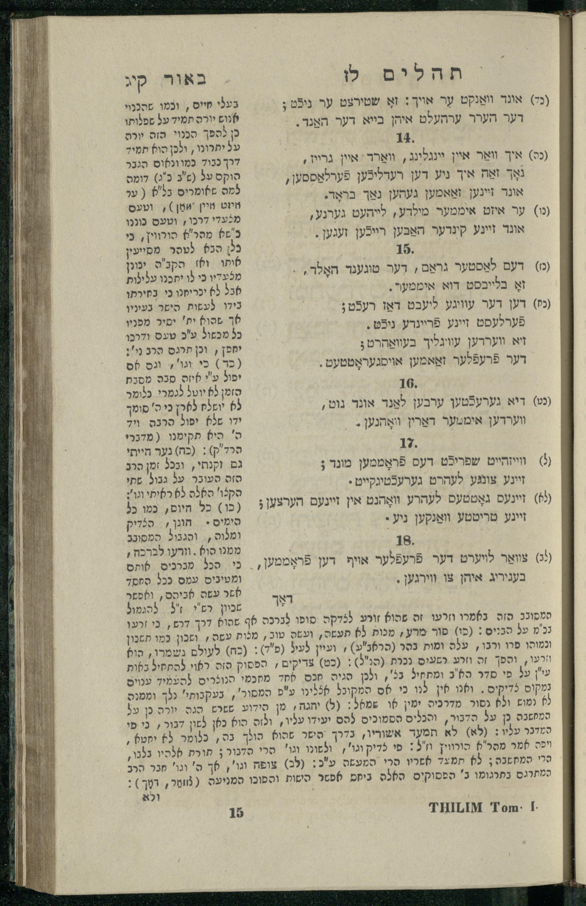 14 (1835) Sefer Tehilim : ʿim Perush Rashi ṿe-targum Ashkenazi me-et Rabenu Mosheh ben Menaḥem n.ʿE., u-veʾur me-et ha-ḥakham ha-mefursam R. Yoʾel Bril asher ḳara be-shem Zemirot Yiśraʾel, ṿe-nilṿeh elaṿ ha-Maʿamar me-et ha-ḥakham ha-medaḳdeḳ mo.h. Ṿolf Meʾir (moreh lashon ʿIvri be-vet ḥinukh ha-normali asher be-Prag), u-ve-tokho nikhlal haʿtaḳah u-veʾur le-khol milot be-laʿaz ha-nimtsaʾot be-Fe. Rashi z.l. / me-et ha-madpis Mosheh ha-Leṿi Landa14 (1835) ספר תהלים / עם פירוש רש״י ותרגום אשכנזי מאת רבינו משה בן מנחם נ״ע, ובאור מאת החכם המפורסם ר' יואל ברי״ל אשר קרא בשם זמירות ישראל, ונלוה אליו המעמר מאת החכם המדקדק מו״ה וואלף מאיר (מורה לשון עברי בבית חנוך הנארמאלי אשר בפראג), ובתוכו נכלל העתקה ובאור לכל מלות בלע״ז הנמצאות בפירש״י ז״ל מאת המדפיס משה הלוי לנדא