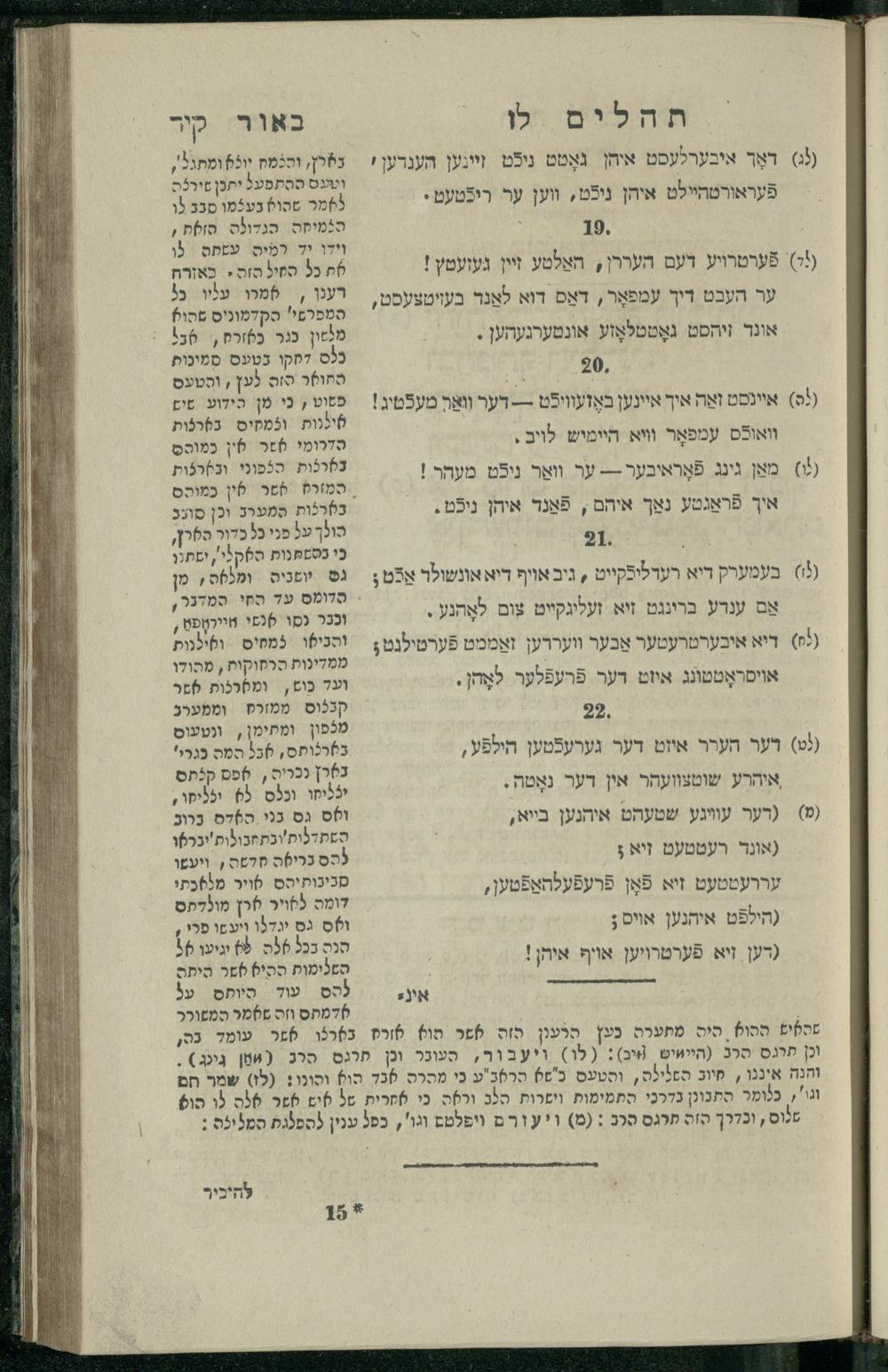 14 (1835) Sefer Tehilim : ʿim Perush Rashi ṿe-targum Ashkenazi me-et Rabenu Mosheh ben Menaḥem n.ʿE., u-veʾur me-et ha-ḥakham ha-mefursam R. Yoʾel Bril asher ḳara be-shem Zemirot Yiśraʾel, ṿe-nilṿeh elaṿ ha-Maʿamar me-et ha-ḥakham ha-medaḳdeḳ mo.h. Ṿolf Meʾir (moreh lashon ʿIvri be-vet ḥinukh ha-normali asher be-Prag), u-ve-tokho nikhlal haʿtaḳah u-veʾur le-khol milot be-laʿaz ha-nimtsaʾot be-Fe. Rashi z.l. / me-et ha-madpis Mosheh ha-Leṿi Landa14 (1835) ספר תהלים / עם פירוש רש״י ותרגום אשכנזי מאת רבינו משה בן מנחם נ״ע, ובאור מאת החכם המפורסם ר' יואל ברי״ל אשר קרא בשם זמירות ישראל, ונלוה אליו המעמר מאת החכם המדקדק מו״ה וואלף מאיר (מורה לשון עברי בבית חנוך הנארמאלי אשר בפראג), ובתוכו נכלל העתקה ובאור לכל מלות בלע״ז הנמצאות בפירש״י ז״ל מאת המדפיס משה הלוי לנדא
