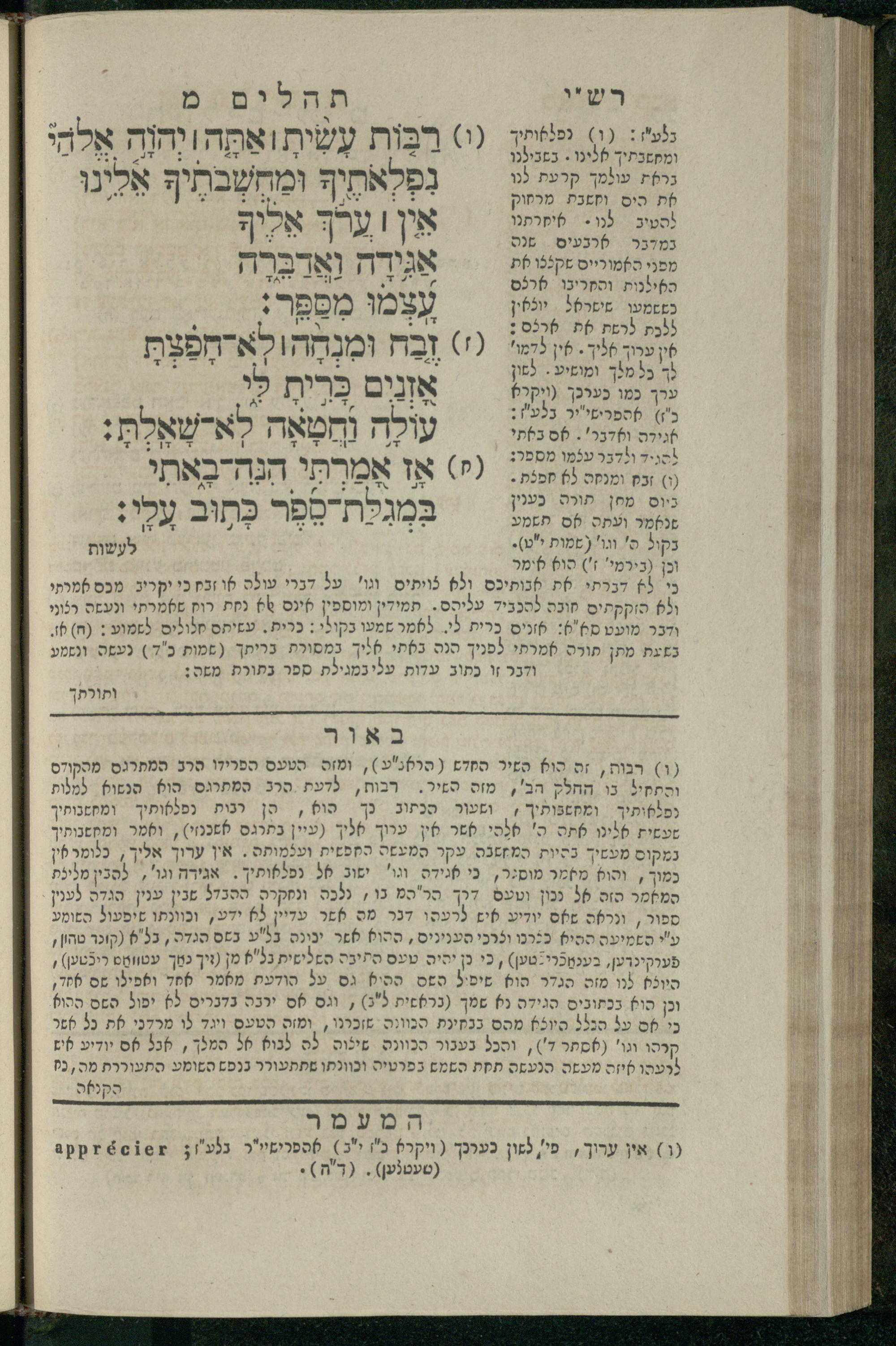 14 (1835) Sefer Tehilim : ʿim Perush Rashi ṿe-targum Ashkenazi me-et Rabenu Mosheh ben Menaḥem n.ʿE., u-veʾur me-et ha-ḥakham ha-mefursam R. Yoʾel Bril asher ḳara be-shem Zemirot Yiśraʾel, ṿe-nilṿeh elaṿ ha-Maʿamar me-et ha-ḥakham ha-medaḳdeḳ mo.h. Ṿolf Meʾir (moreh lashon ʿIvri be-vet ḥinukh ha-normali asher be-Prag), u-ve-tokho nikhlal haʿtaḳah u-veʾur le-khol milot be-laʿaz ha-nimtsaʾot be-Fe. Rashi z.l. / me-et ha-madpis Mosheh ha-Leṿi Landa14 (1835) ספר תהלים / עם פירוש רש״י ותרגום אשכנזי מאת רבינו משה בן מנחם נ״ע, ובאור מאת החכם המפורסם ר' יואל ברי״ל אשר קרא בשם זמירות ישראל, ונלוה אליו המעמר מאת החכם המדקדק מו״ה וואלף מאיר (מורה לשון עברי בבית חנוך הנארמאלי אשר בפראג), ובתוכו נכלל העתקה ובאור לכל מלות בלע״ז הנמצאות בפירש״י ז״ל מאת המדפיס משה הלוי לנדא